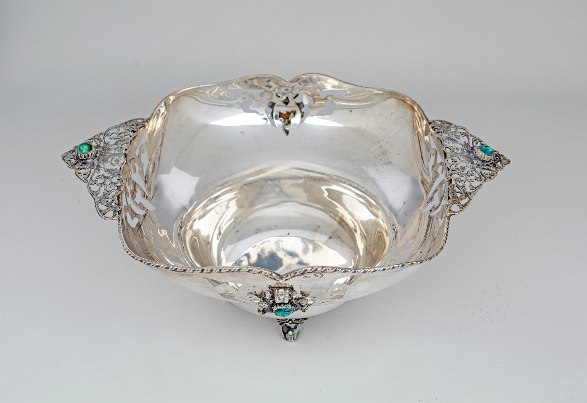 Vaschetta centrotavola quadrangolare orlo curvilineo caratterizzata da gemme cabochon verde striato poste sulla sommità delle anse ed al centro dei due lati;  piedi in forma di cartiglio cm 11x25x18 - gr. 314 argento 800/000