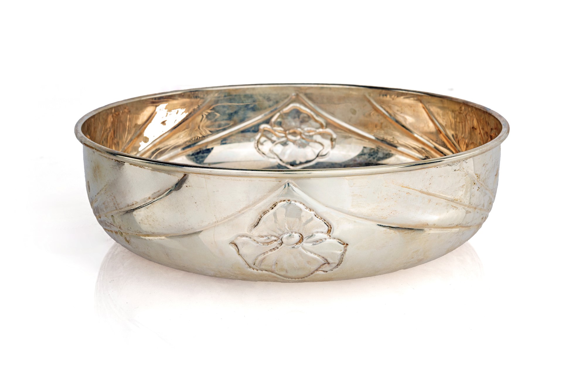 Ciotola decorata da quattro grandi fiori diametralmente opposti incisi, affiancati da linee sagomate cm 6,5x24 - gr. 332 argento 800/000