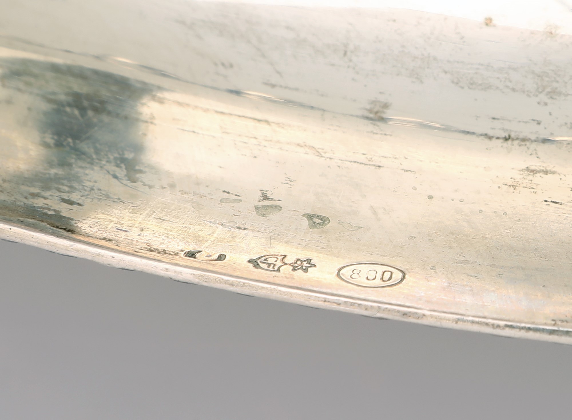 Centrotavola biansato di forma ovale in parte baccellato piedi con attacco a palmetta terminanti a ricciolo; profilo superiore percorso da unghiature incluse entro perline infinitesimali; manici sagomati a nastro sdoppiato cm 13x29x20,5 - gr. 1.052 argento 800/000