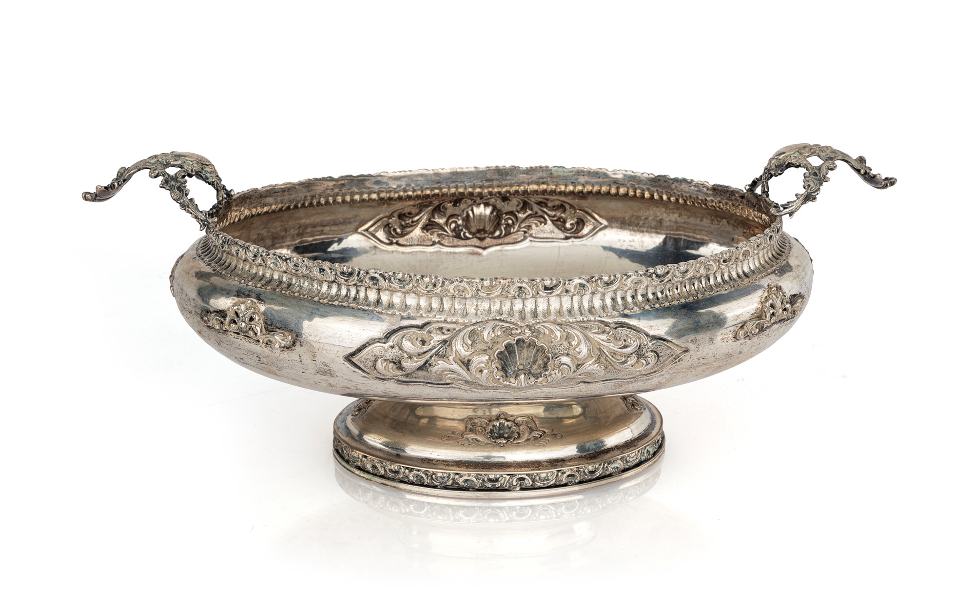 Grande coppa ovale biansata decorata da riserve centrate da conchiglia circondata da motivi vegetali sbalzati, motivi decorativi ripresi sul piede; anse fuse in forma di cartiglio arcuato congiunto all'orlo da motivi vegetali cm 44x24 - gr. 1396 argento 800/000