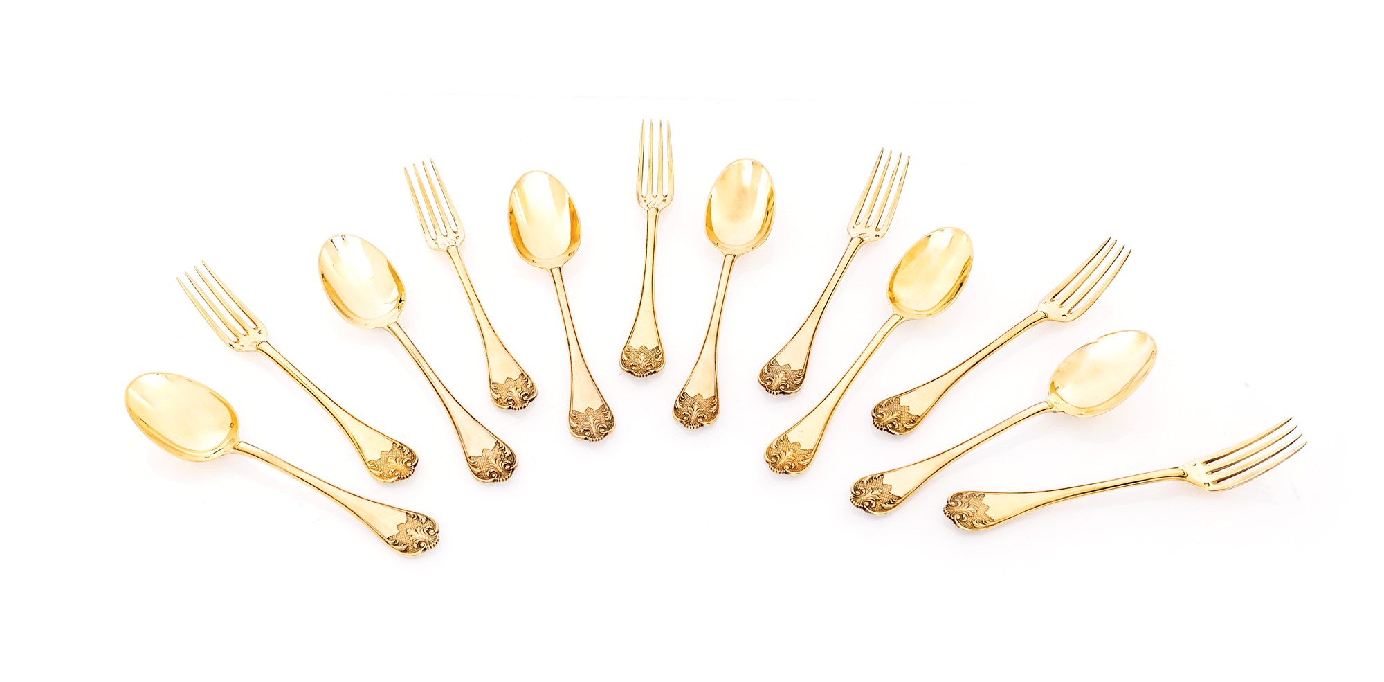 Sei cucchiai e sei forchette da pasto, Francia XIX secolo caratterizzati da vertici cesellati cm 18 - peso complessivo gr. 700 argento dorato