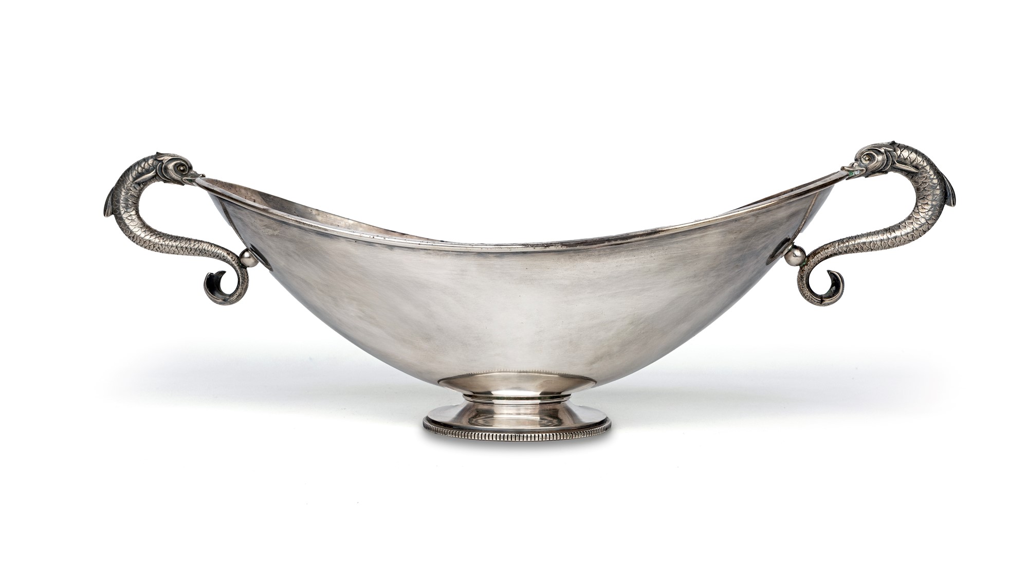 Centrotavola a navicella anse in forma di delfino, piede circolare cm...