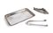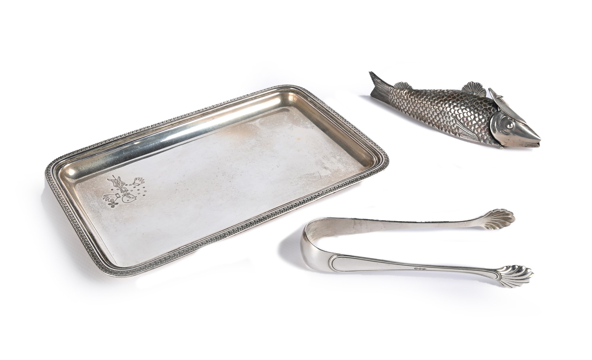 Tre oggetti in argento 800/000 piccolo vassoio rettangolare, R. Miracoli Milano, con angoli arrotondati e profilo a palmette, caratterizzato da un giullare stilizzato inciso; un contenitore a forma di pesce ed una pinza per zollette cm 13x20 - peso complessivo gr. 294