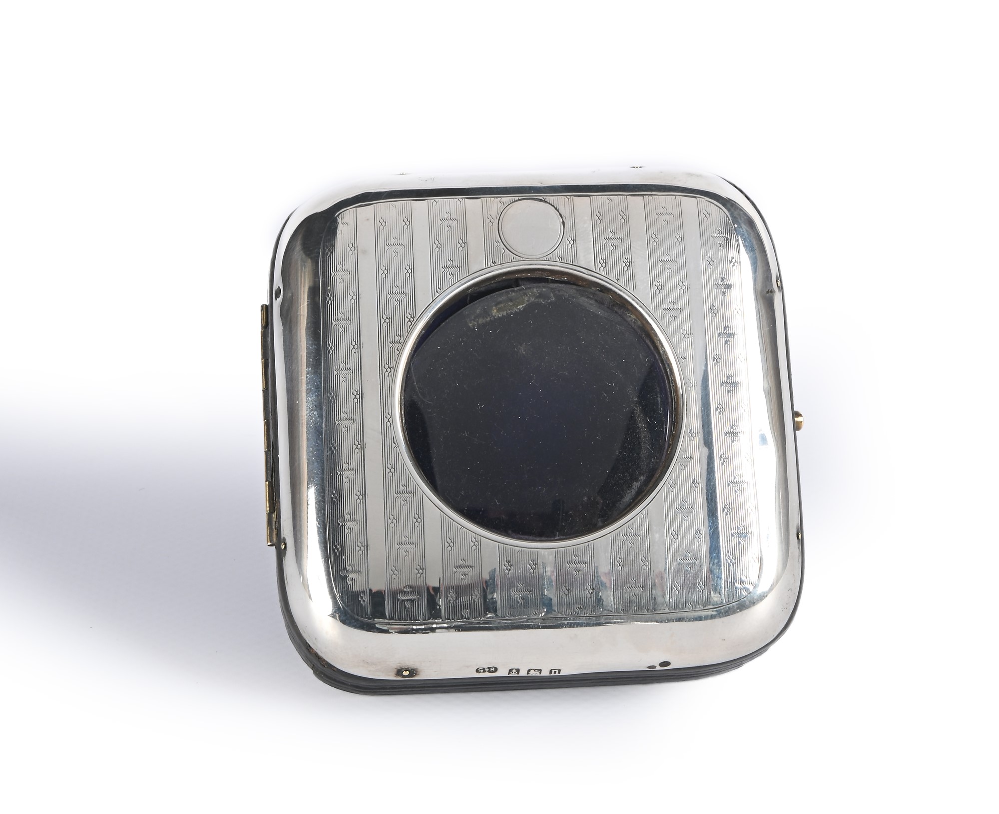 Scatola porta orologio in lamina d'argento, pelle e velluto blu, Birmingham, 1912 cm 9x9