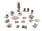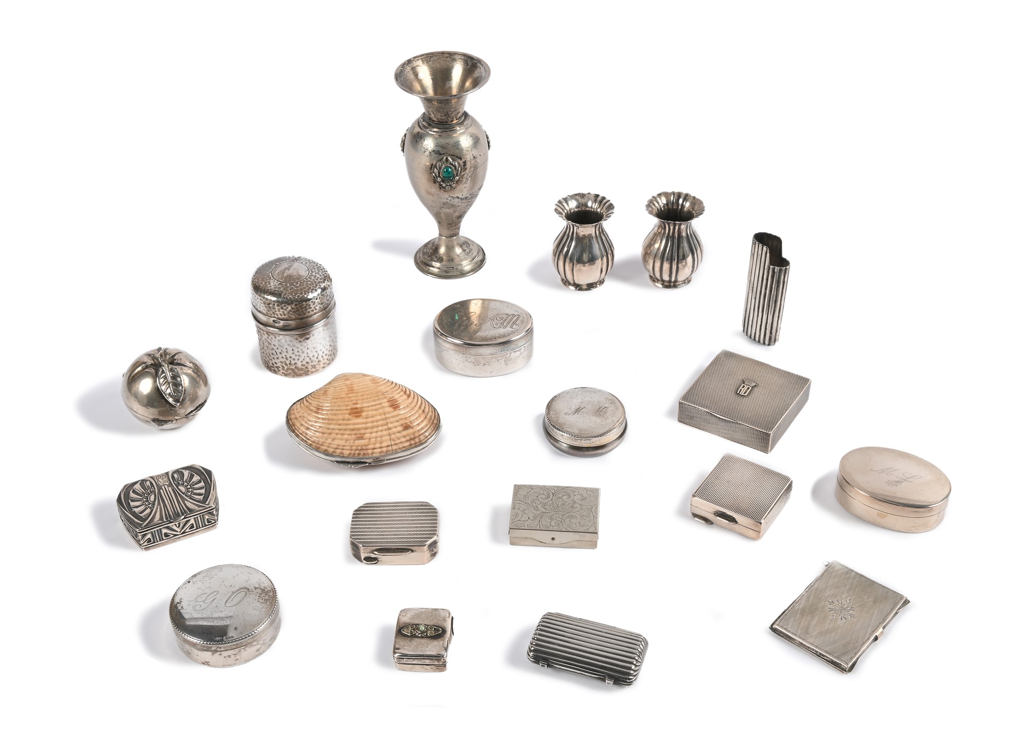 Lotto composto da piccoli oggetti in argento coppia di vasetti percorsi da sottili nervature (altezza cm 4,5); anforetta con tre gemme cabochon (altezza cm 12); tredici portapillole (fogge e misure diverse) ed uno composto da conchiglia (cm 7,5x5); un copri accendino da tasca modello "bic" ed un piccolo portafoto a libretto peso complessivo gr. 450