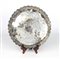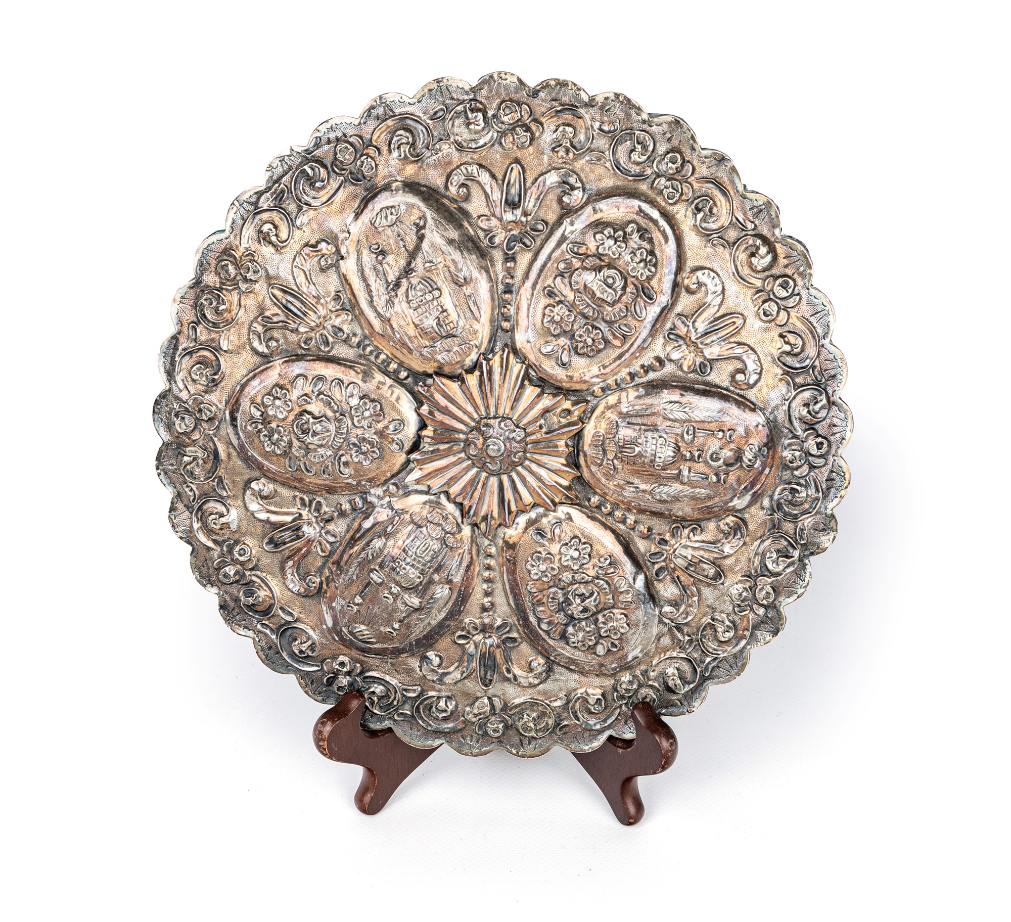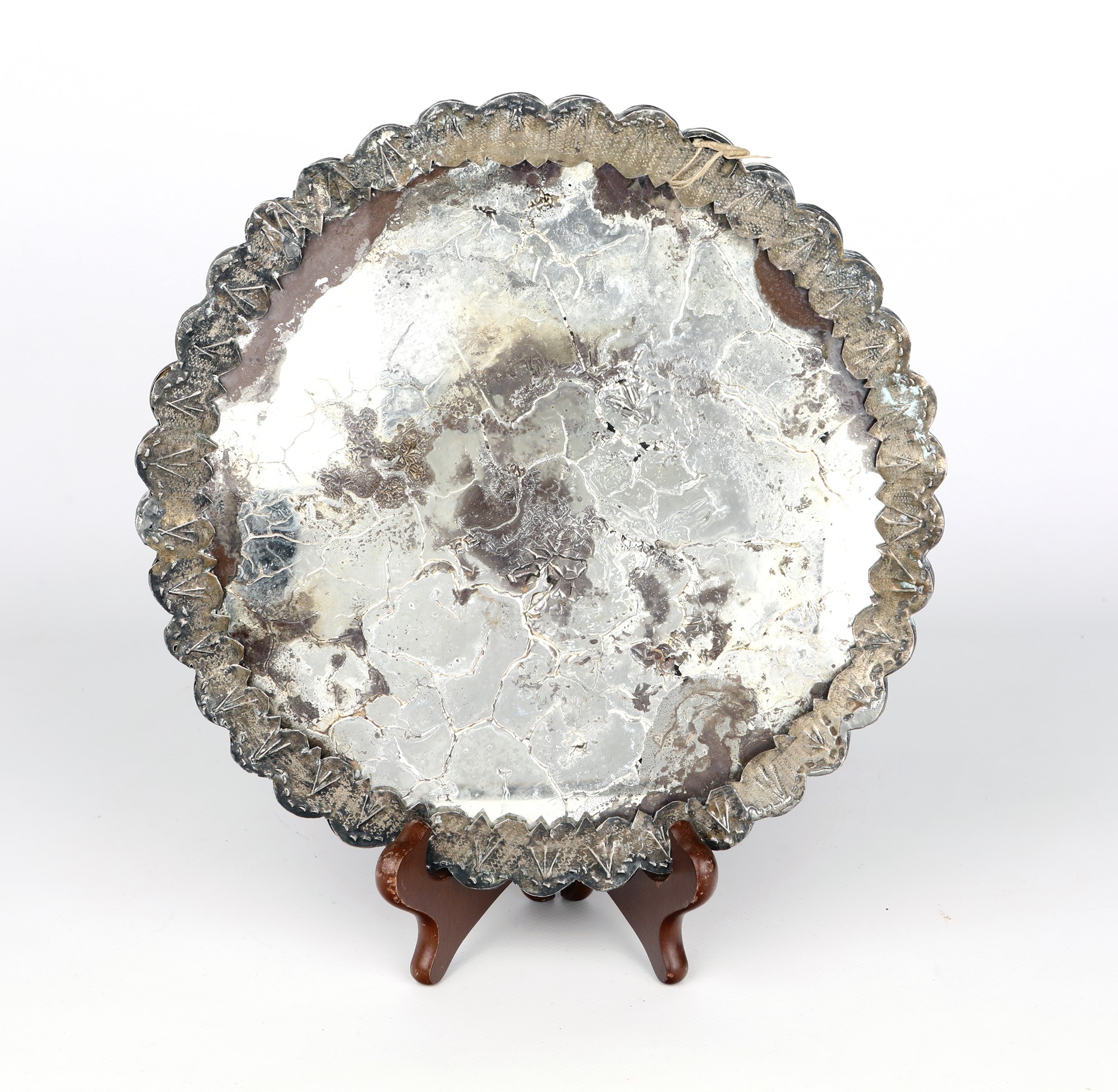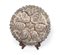 Antico specchio da parete in lamina d'argento sbalzata, Turchia di forma circolare con stella raggiata centrale da cui si dipartono sei petali decorati da moschee con minareti alternati a composizioni fiorite; profilo centinato e bordura percorsa da volute vegetali e fiori. Difetti allo specchio diametro cm 26