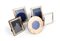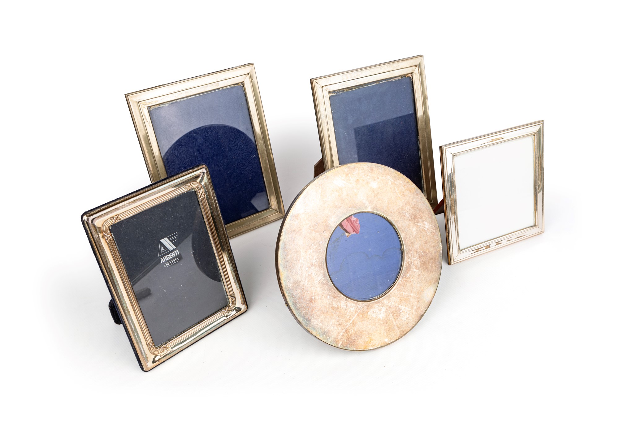 Cinque cornici da tavolo diverse in lamina d'argento tre rettangolari di cui una coppia, una quadrata ed una circolare. Supporti in legno e in velluto. Difetti misure diverse