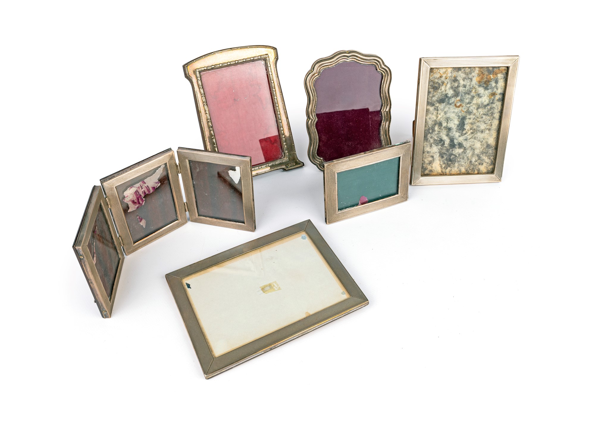 Sei cornici da tavolo diverse in lamina d'argento di cui una a trittico e tre rettangolari con fascia zigrinata; due di forma sagomata. Difetti misure diverse