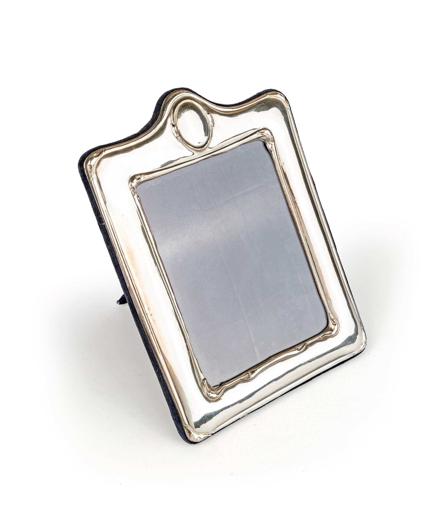 Cornice da tavolo di impostazione verticale a fascia liscia e cimasa con cartiglio centrale; supporto rivestito in velluto cm 27x19,5 (luce interna cm 17x12,5) lamina d'argento