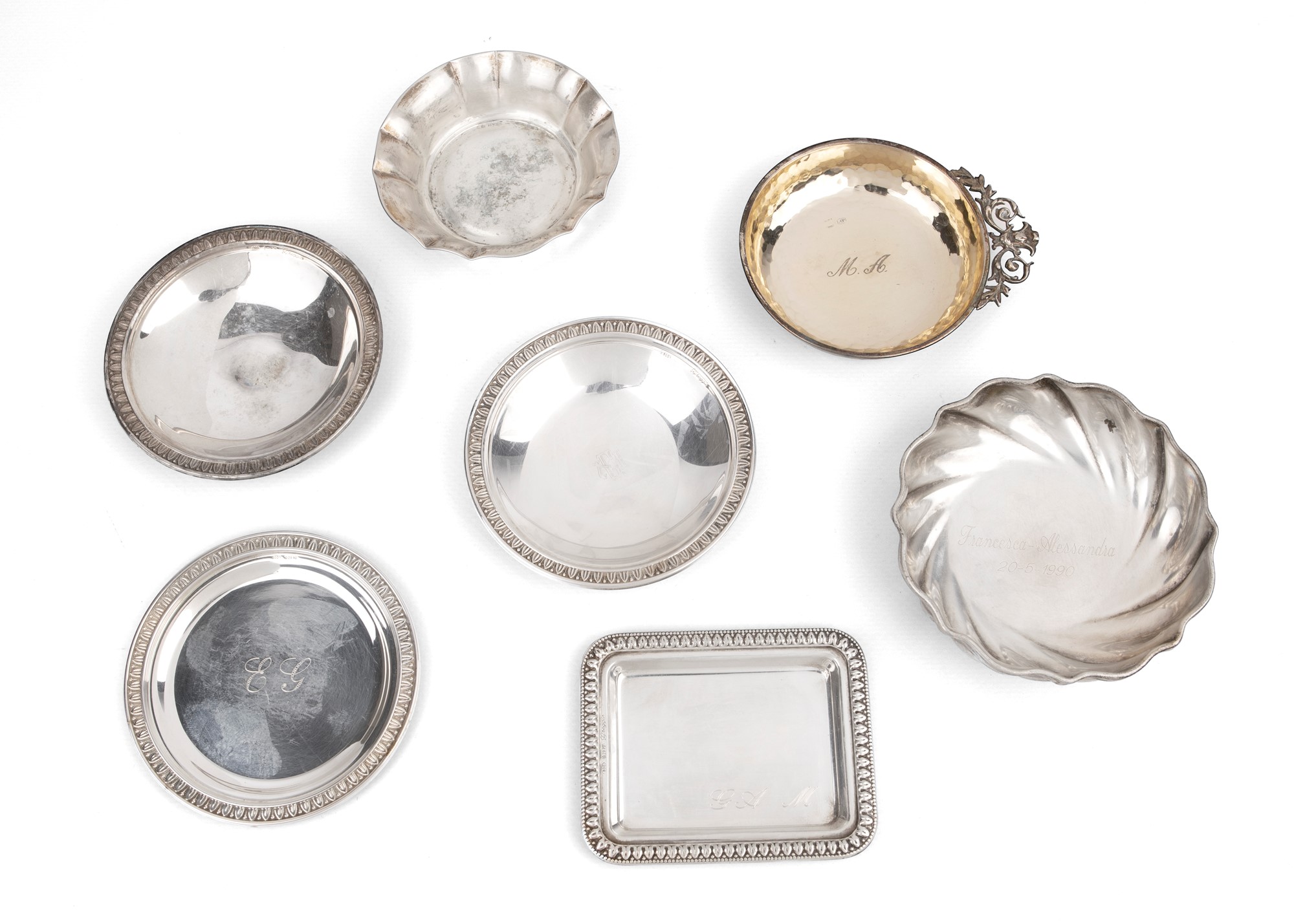 Lotto composto da sette bomboniere diverse in argento quattro piattini di diversa forma e misura e tre ciotoline, anch'esse di foggia diversa; ogni elemento è personalizzato con iniziali o dedica incise peso complessivo gr. 155
