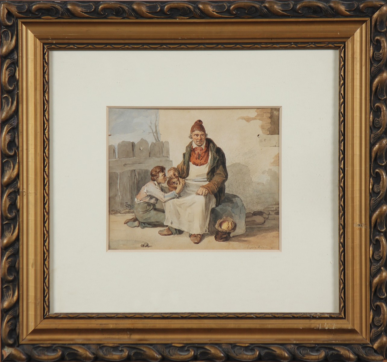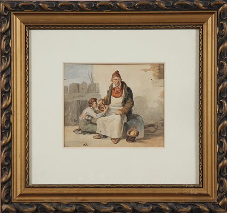 BOSA EUGENIO (1807 - 1875) Figure di bambino e uomo. Acquerello . Cm 20,50 x 18,00. Firma Eugenio Bosa Venezia in basso a destra. Cornice presente