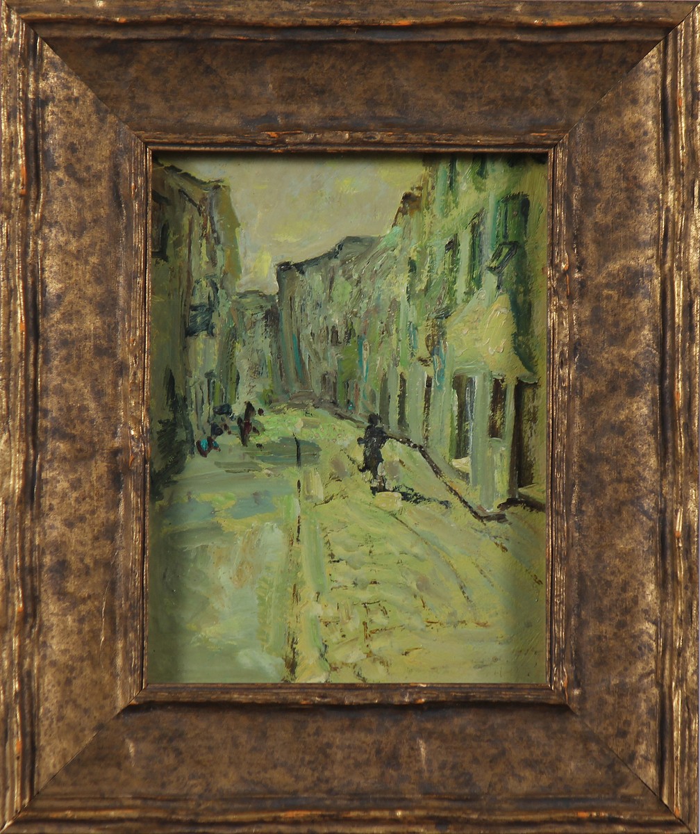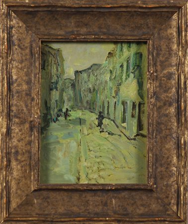 ANONIMO Paesaggio urbano. olio su carta incollato su tavola. Cm 18,00 x 24,00. Firma in basso a destra. Cornice presente