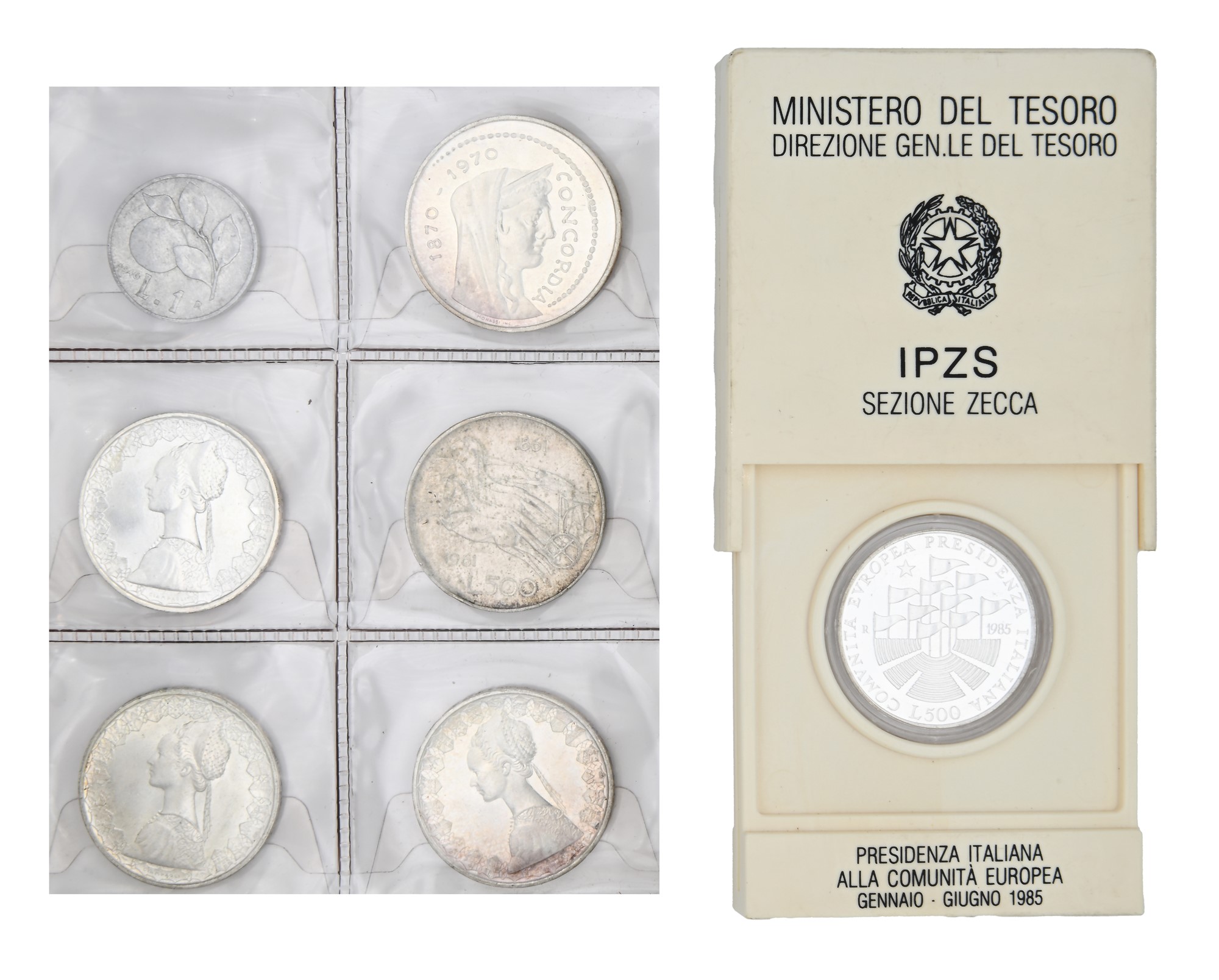 Lotto di monete Repubblica Italiana: 1 lira 1946, 5 pezzi da 500 lire e 1.000 lire 1970