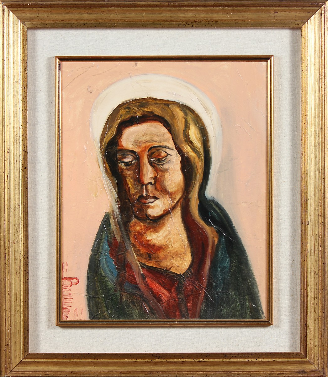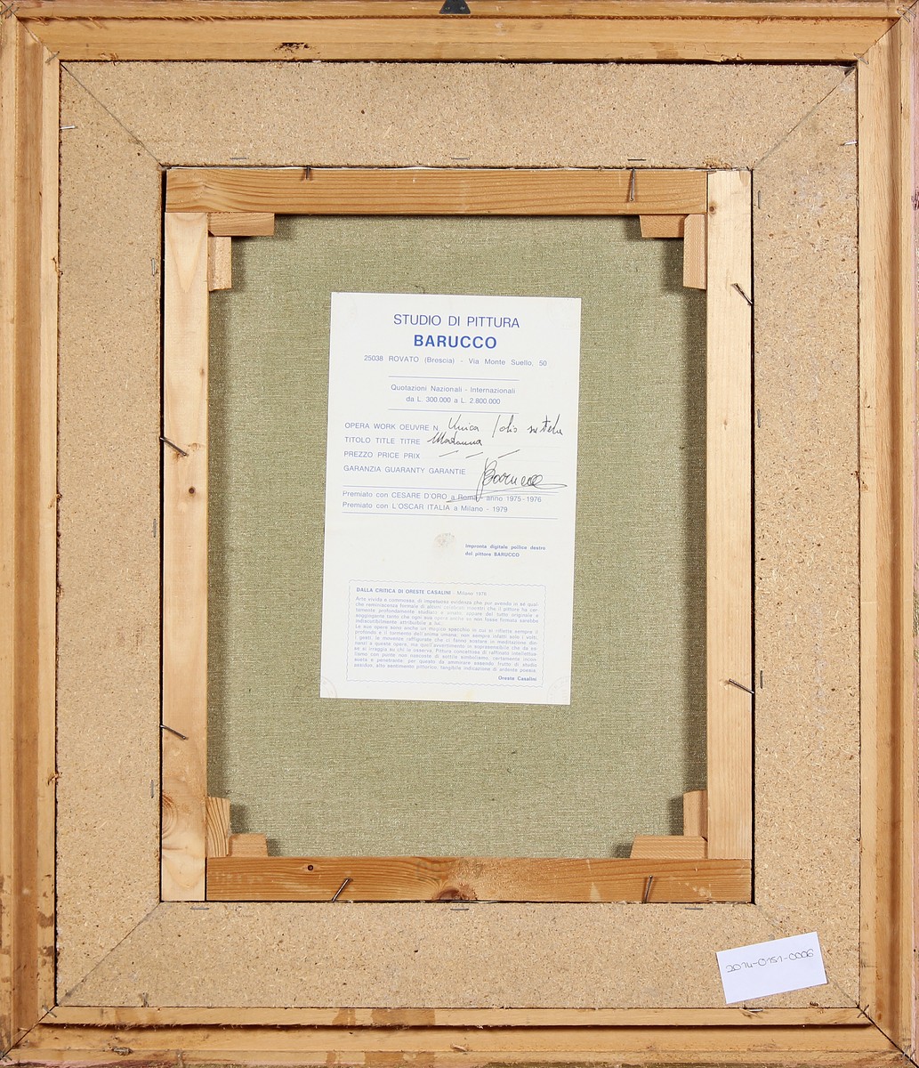 BARUCCO GIACOMO (n. 1852) Madonna. Olio su tela . Cm 40,00 x 50,00. Firma in basso a sinsitra. Al retro firma ed etichetta dello studio di pittura Barucco, Rovato. Cornice presente
