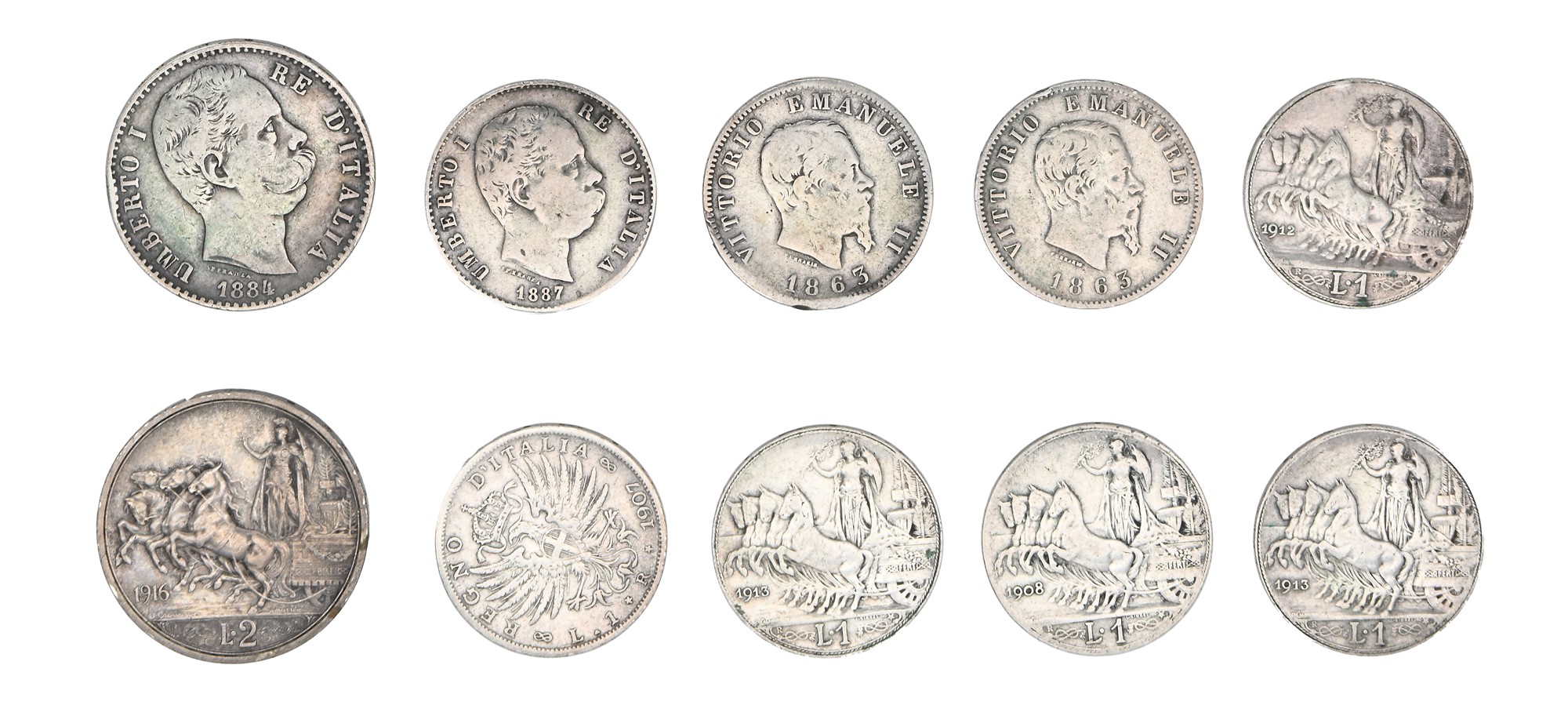 Lotto 10 monete Regno d'Italia: 1 Lira 1863 Torino; 1 Lira 1863 Milano Vittorio Emanuele II; 2 Lire Roma 1884; 1 Lira Milano 1887 Umberto I; 2 Lire 1916; 1 Lira 1907; 1 Lira 1908, 1 Lira 1912; 1 Lira 1913 (2 esemplari) Vittorio Emanuele III