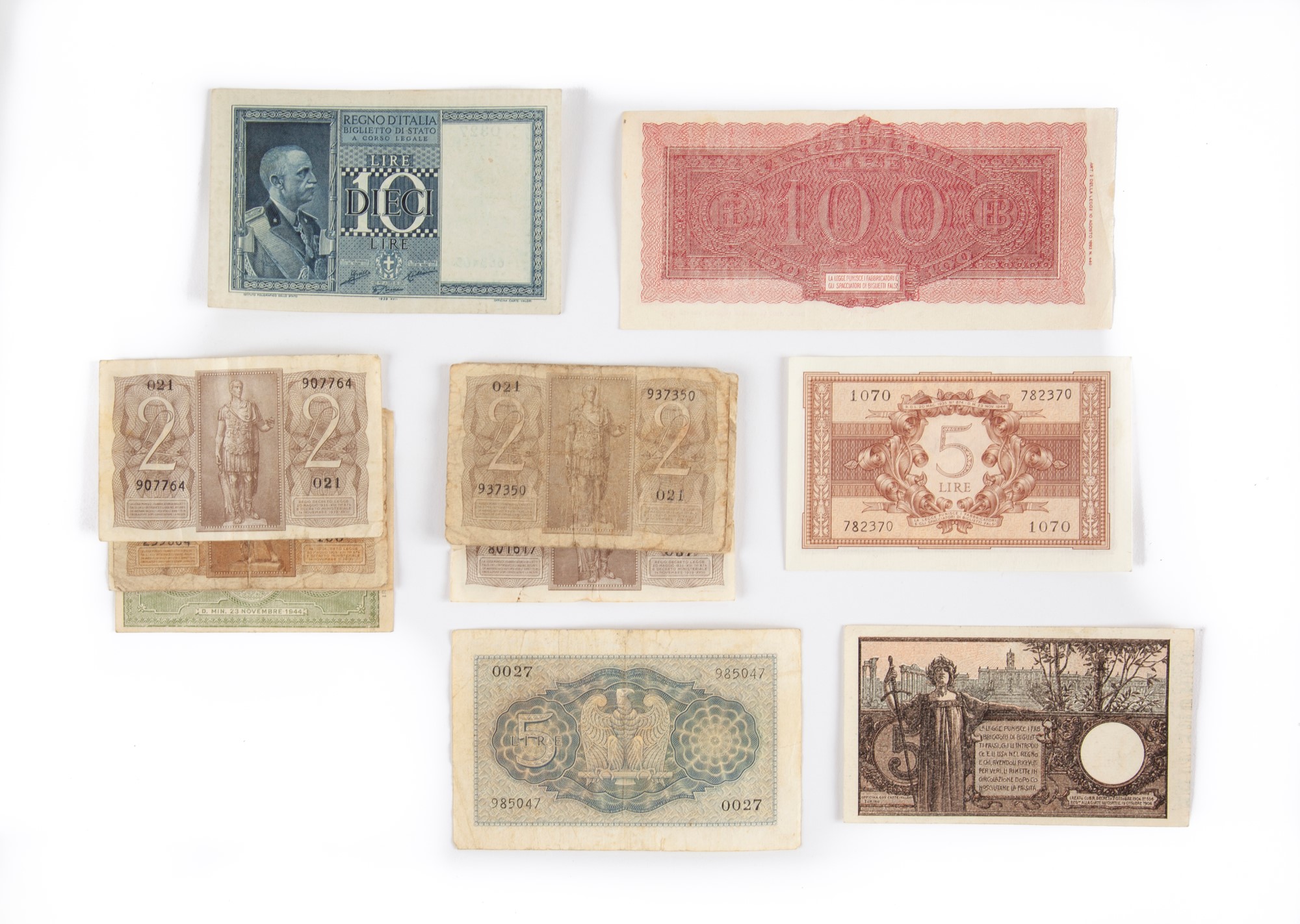Lotto Cartamoneta Regno d'Italia e Luogotenenza: 5 Lire Biglietto di Stato 1904 Floreale Vittorio Emanuele III Seriale 5050 035932 Dall'Ara-Righetti; 5 Lire Biglietto di Stato 1938-XVII Fascio Vittorio Emanuele III Serie 0327 663465; 100 Lire Italia Turrita Testina 10/12/1944 Serie M22 074317 e 5 Lire Biglietto di Stato Atena 23/11/1944 Serie 1070 782370 Umberto II Insieme a 5 Lire Fascio 1940, 5 esemplari da 2 Lire Fascio 1939, 2 esemplari 1 Lira Fascio 1939 e 1 Lira 23/11/1944.