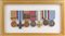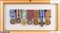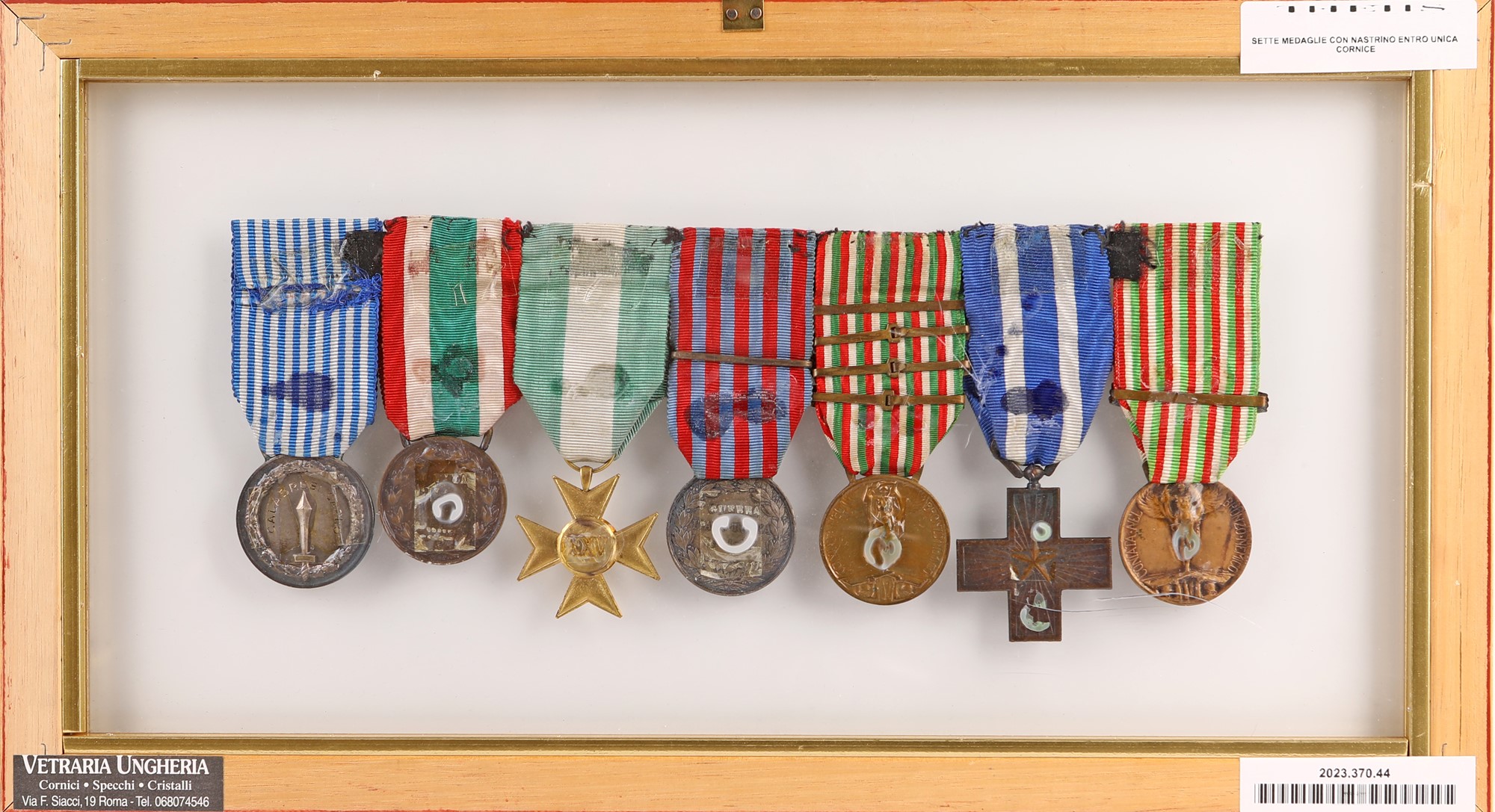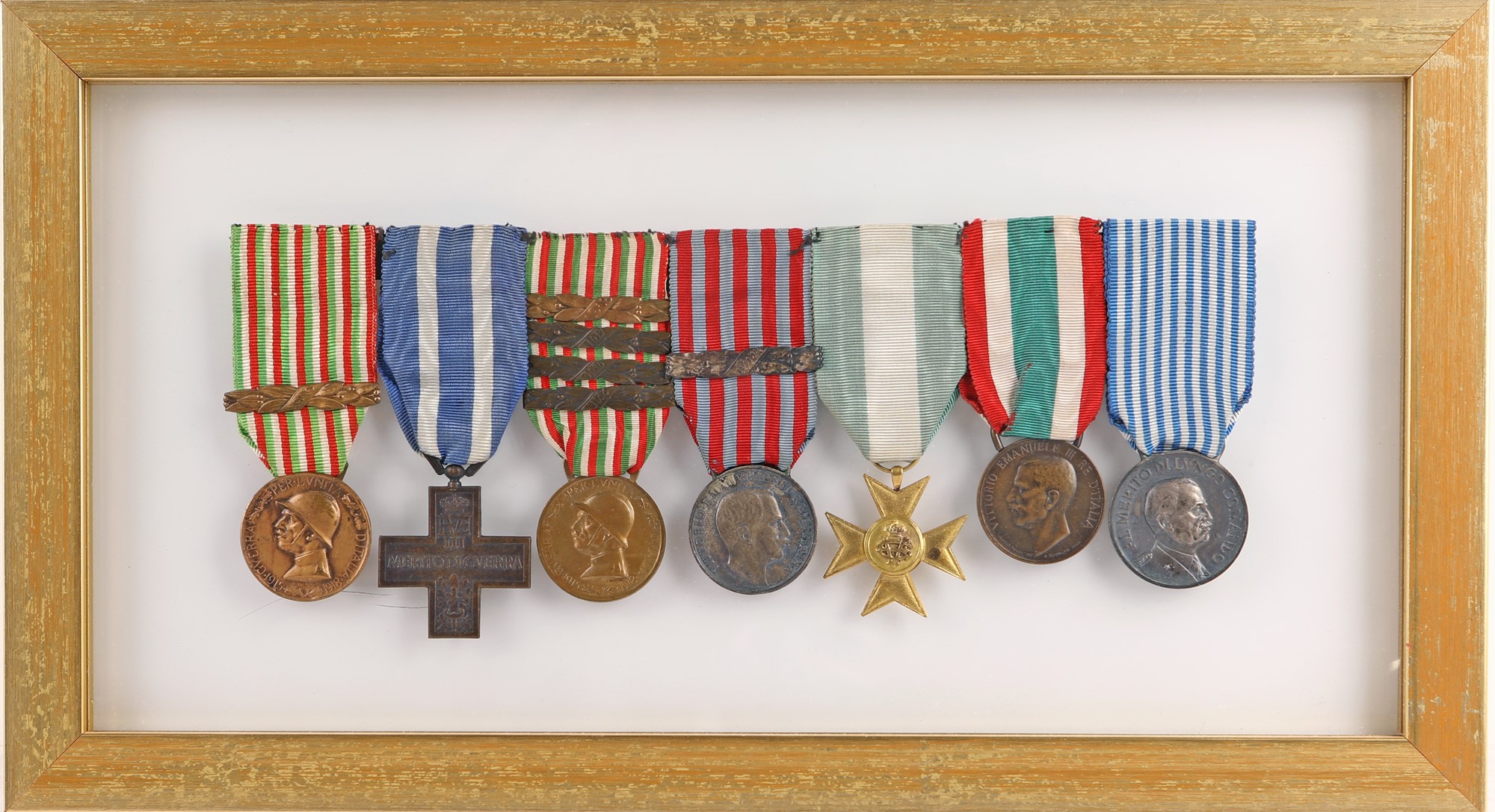Sette medaglie con nastrino Vittorio Emanuele III: 2 esemplari della Guerra 1915-18 Coniata nel bronzo nemico; Al merito di Guerra; Guerra Italo-turca 1911-12 (in argento); XXV di Servizio; Unità d'Italia 1848-1918; Al merito di lungo Comando (in argento) Montate entro unica cornice con vetro.