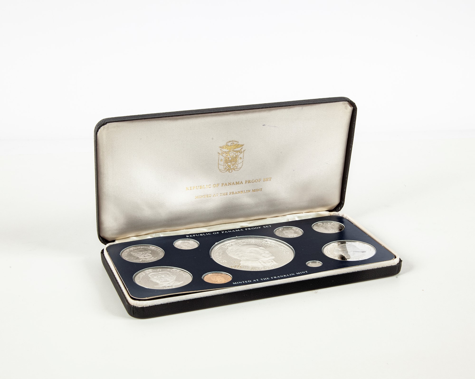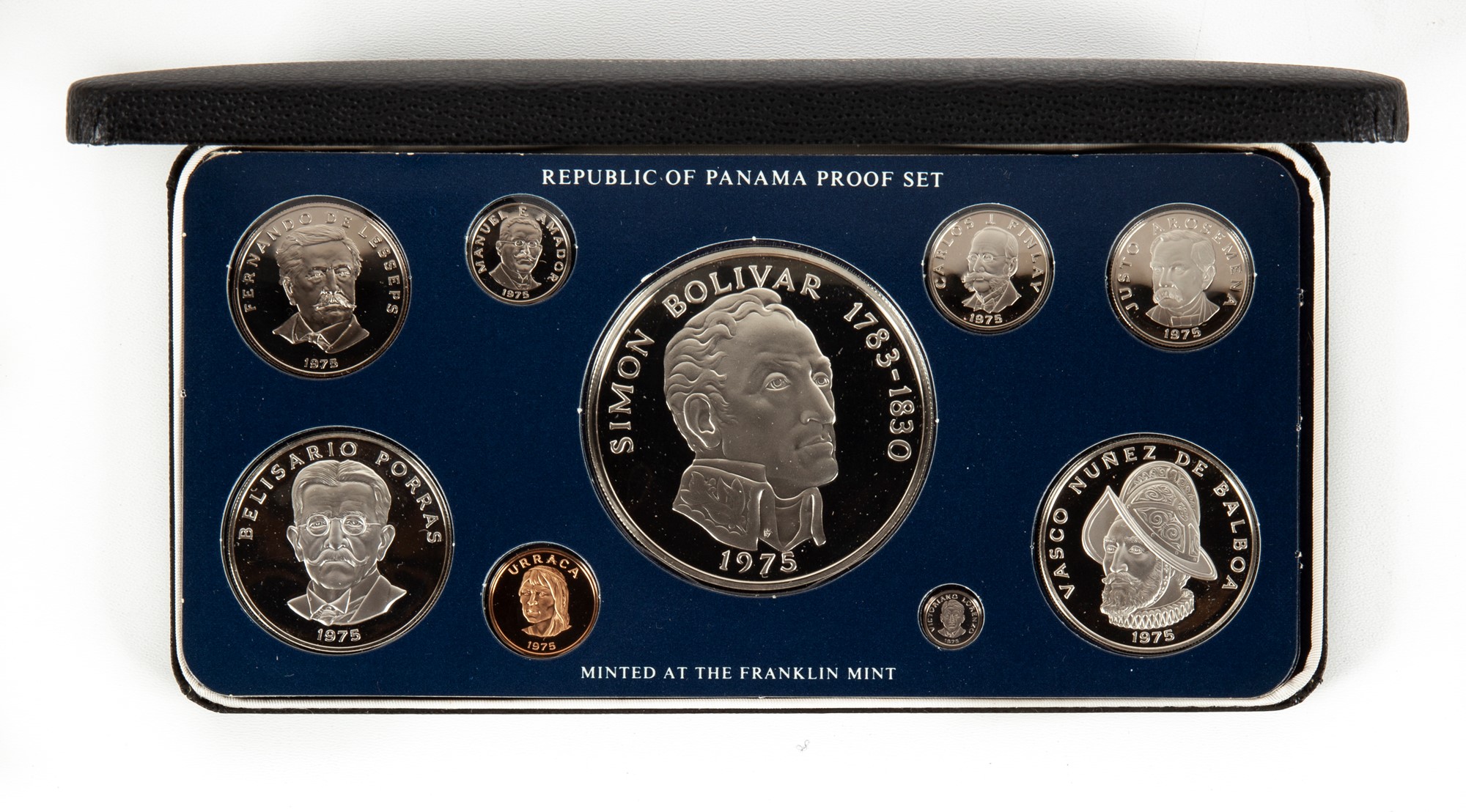 Serie divisionale completa di 9 monete proof: 20, 5, 1 Balboas, 50, 20, 10, 5, 2,5 e 1 Cts 1975 Repubblica di Panama Entro cofanetto originale e custodia in cartone. Certificati di garanzia