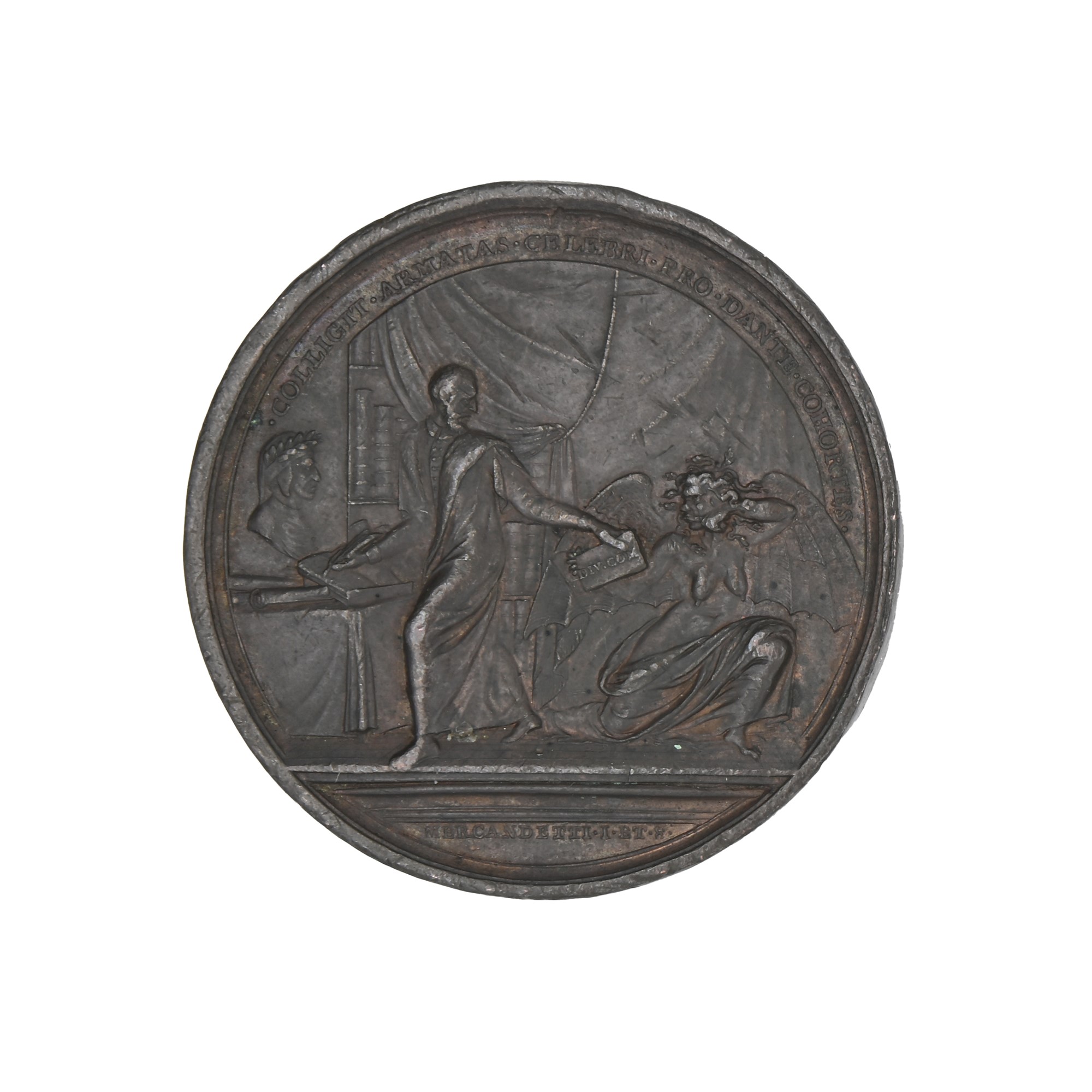 Medaglia in bronzo commemorativa di Jacopo Mazzoni (1548-1598); datata 1809 e firmata Mercandetti - D/ Busto con bavero e pelliccia IACOBVS MAZZONI sotto MERCANDETTI F. ROMAE MDCCCIX R/ Scena allegorica col Mazzoni in piedi, presso uno scrittoio col busto di Dante, mentre scrive e riceve da medusa alata una tavoletta COLLIGIT•ARMATAS•CELEBRI•PRO•DANTE•COHORTES Peso gr. 56,20 Medaglia coniata nel 1809 per ricordare il filosofo, letterato ed astronomo J.Mazzoni, fa parte della Serie degli Uomini Illustri realizzata dal Mercandetti. Johnson 235 Diametro mm 50