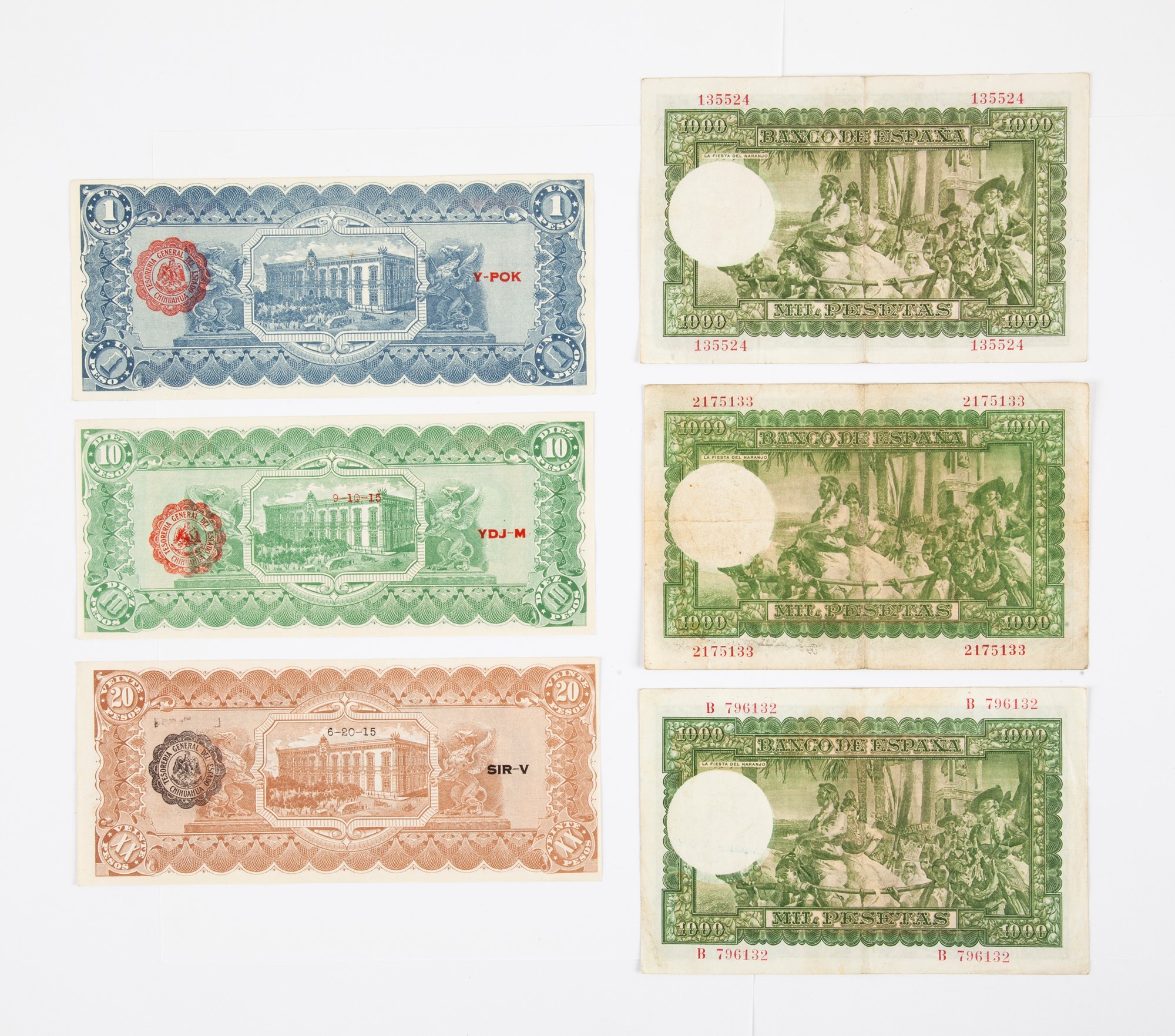 Lotto di Cartamoneta: 3 esemplari 1.000 Pesetas Joaquin Sorolla 31/12/1951, Serie 135524; 2175133; B796132. Rivoluzione Messicana 20 Pesos Estado de Chihuahua 1915K, 10 Pesos Estado de Chihuahua 1915N, 1 Peso Estado de Chihuahua 1915A Rivoluzione Messicana 20 Pesos Estado de Chihuahua 1915K, 10 Pesos Estado de Chihuahua 1915N, 1 Peso Estado de Chihuahua 1915A