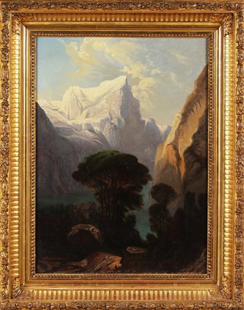 ARTISTA DEL XIX SECOLO Paesaggio montano. Olio su tela . Cm 54,00 x 73,00. Firmato A. Pivent e datato 1864 in basso a sinistra. Cornice presente