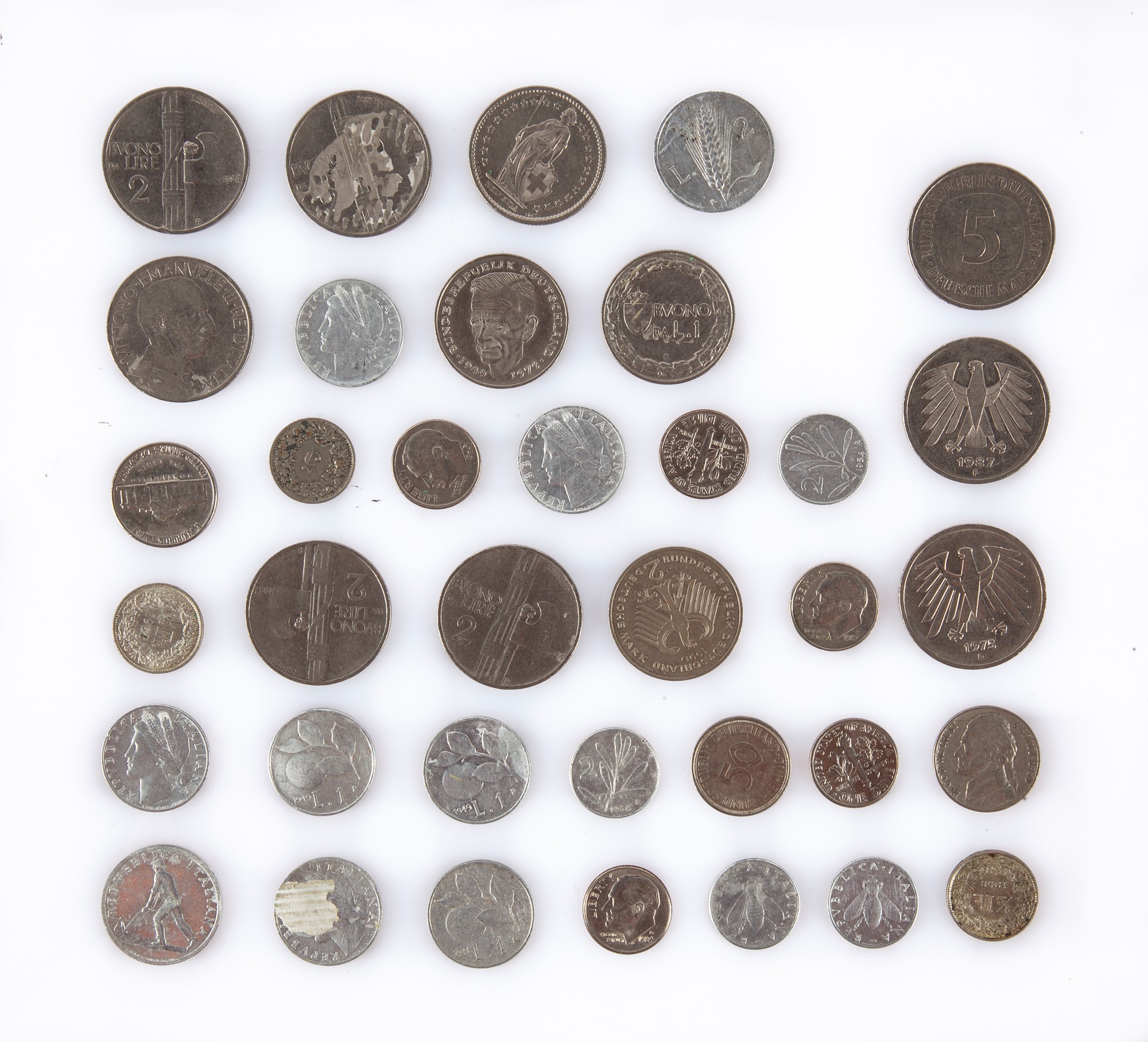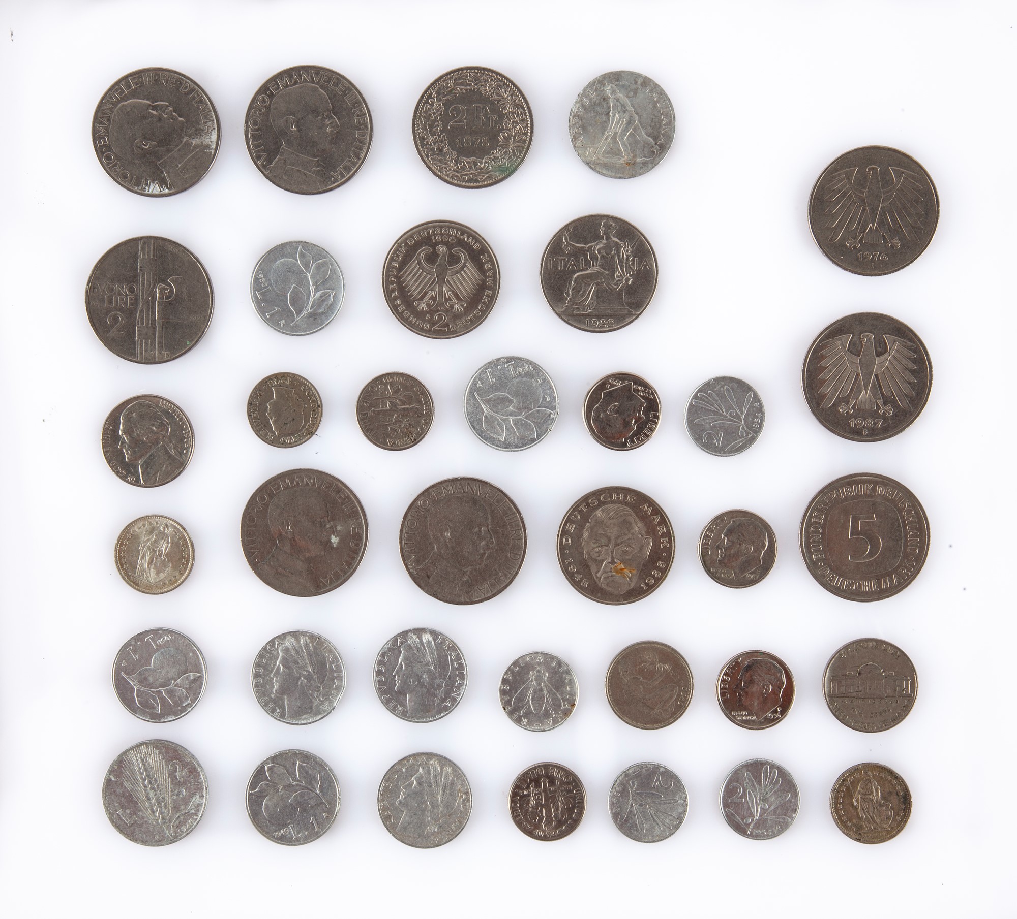 Lotto monete: Buono 2 Lire 1923; 1924 (4); Buono da 1 Lira 1922 Vittorio Emanuele Regno d'Italia; 2 Lire 1946; 1950; 1954 (3); 1956; 1 Lira 1948; 1949 (3); 1950 (3) 3 esemplari 5 Marchi; 2 esemplari 2 Marchi, 50 Pfenning 1972 Germania; 2 Franchi 1979; 2 esemplari da 1/2 Franco; 5 Rappen Svizzera; 5 esemplari da 10 Centesimi USA; 2 esemplari da 5 Centesimi USA.
