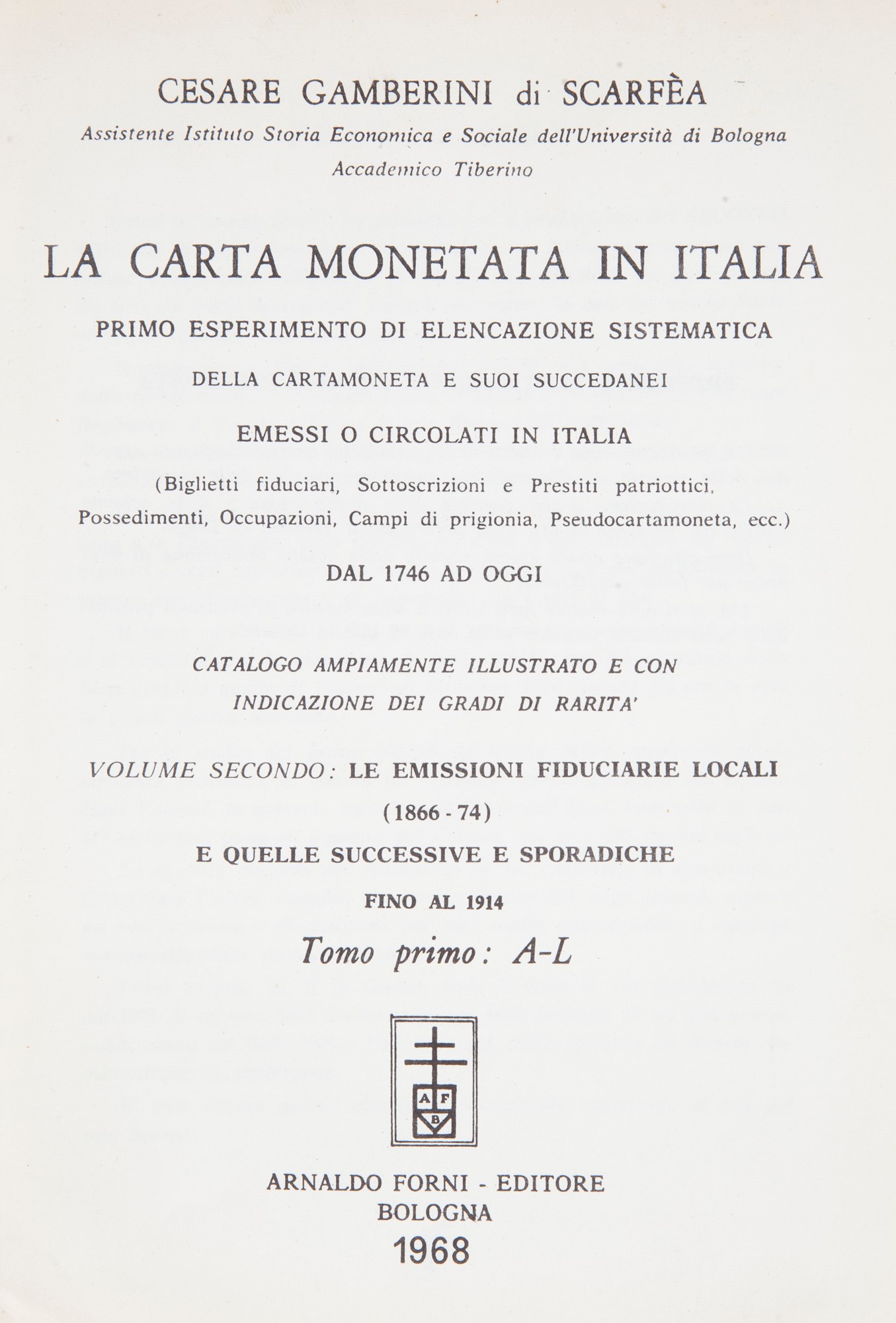 Cesare Gamberini di Scarfea - La Carta Monetata in Italia. Volume Secondo: Le emissioni fiduciarie locali (1866-1874) e quelle successive e sporadiche fino al 1914 Tomo Primo A-L Legatura editoriale in tela, titoli e fregi in oro al dorso. Arnaldo Forni Editore, Bologna 1968
