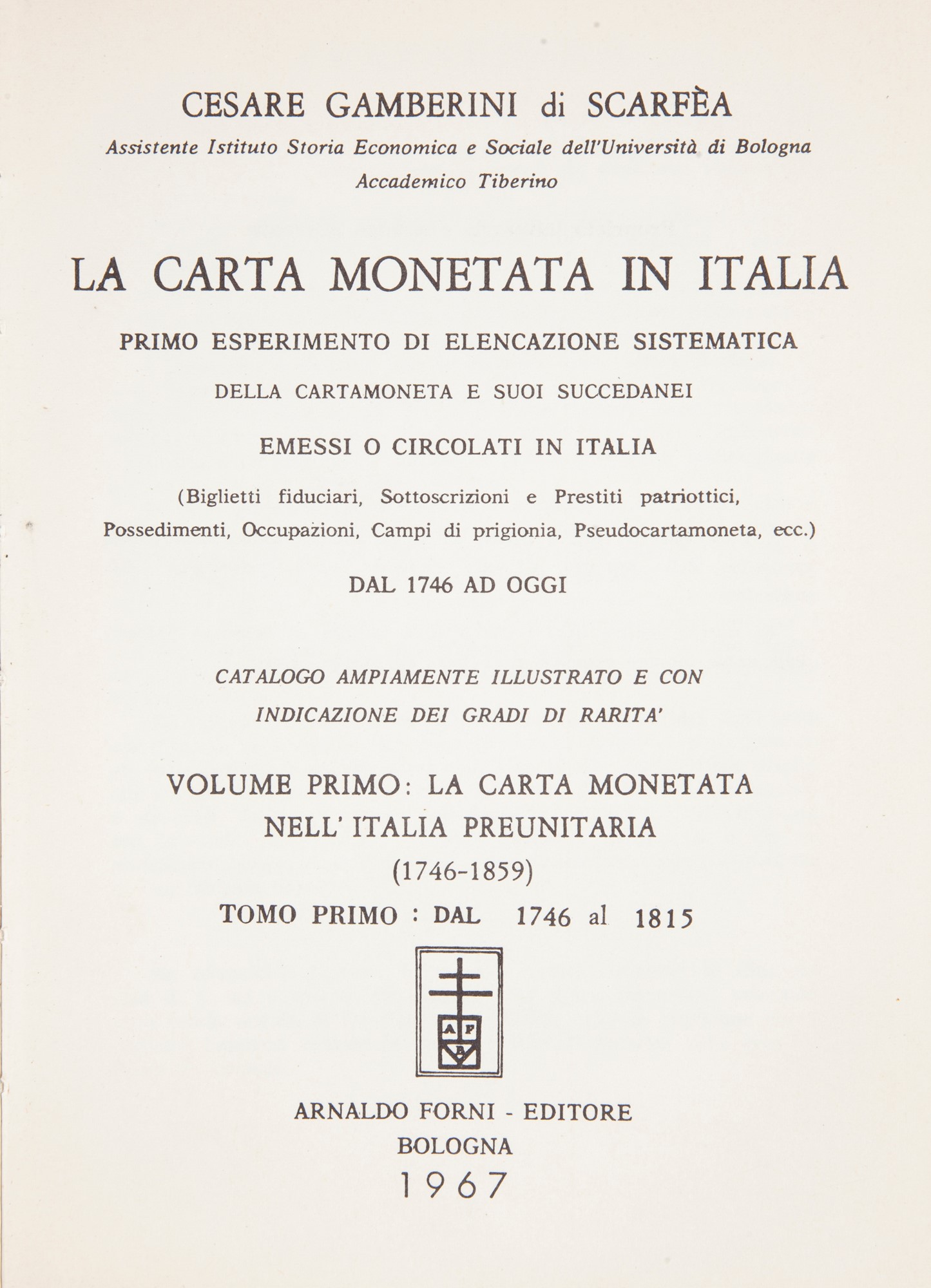 Cesare Gamberini di Scarfea - La Carta Monetata in Italia. Volume Primo La Carta Monetata nell'Italia Preunitaria (1746-1859) Tomo Primo Dal 1746 al 1815 Legatura editoriale in tela, titoli e fregi in oro al dorso. Arnaldo Forni Editore, Bologna 1967