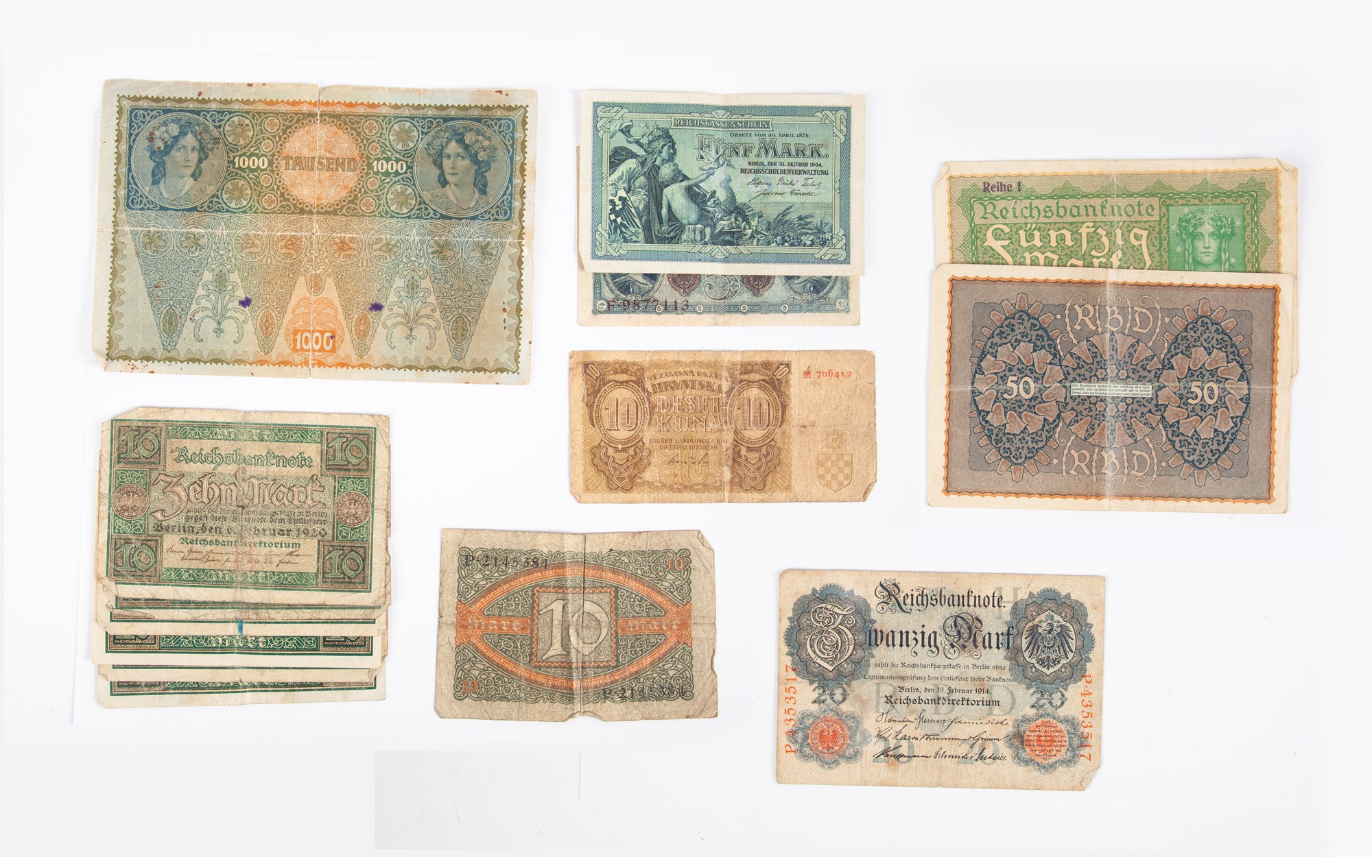 Lotto di cartamoneta: 1.000 Corone 1902 Austria-Ungheria soprastampate DeutschOsterreich 1919; 5 Marchi 1904 Secondo Reich; 20 Marchi 1914 Secondo Reich; 5 Marchi 1914 Secondo Reich; 2 esemplari 50 Marchi 1919 Repubblica di Weimar; 7 esemplari 10 Marchi 1920 Repubblica di Weimar Germania; 10 Kuna 1941 Croazia