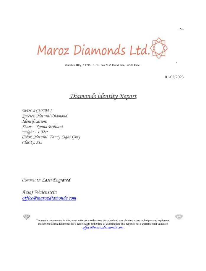 DIAMANTE NATURAL POLISHED 1,02 CARATI NATURAL FANCY GRIGIO CHIARO - PUREZZA SI3 - TAGLIO BRILLANTE - PUREZZA INCISO AL LASER - CERTIFICATO GEMMOLOGICO MAROZ DIAMONDS LTD MEMBRO ISRAEL DIAMOND EXCHANGE - C30204-2