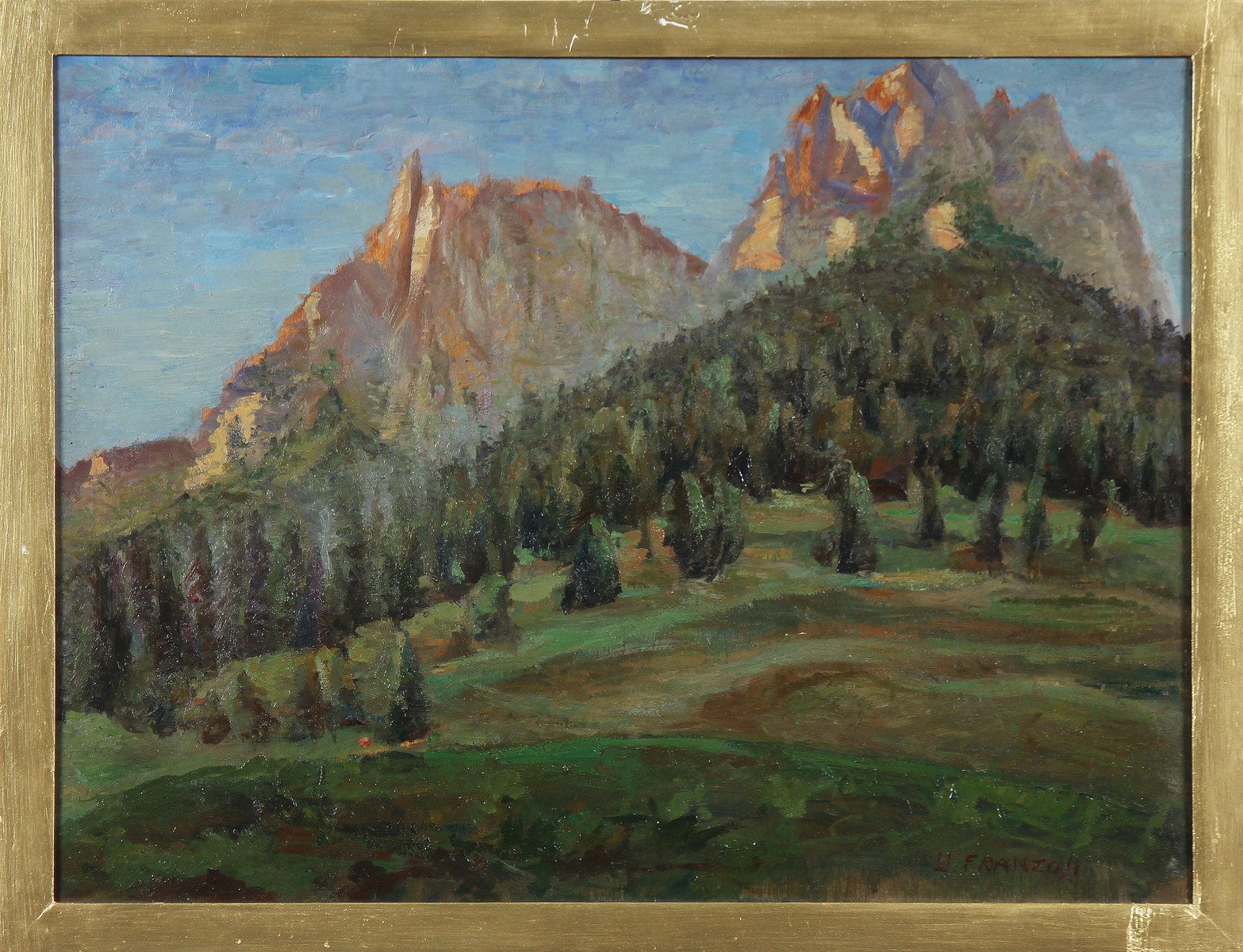 FRANZOSI UMBERTO CARLO (n. 1892) Paesaggio dolomitico. Olio su tavola. Cm 60,00 x 46,00. firma in basso a destra. Al retro reca cartiglio descrittivo dell'opera. Cornice presente