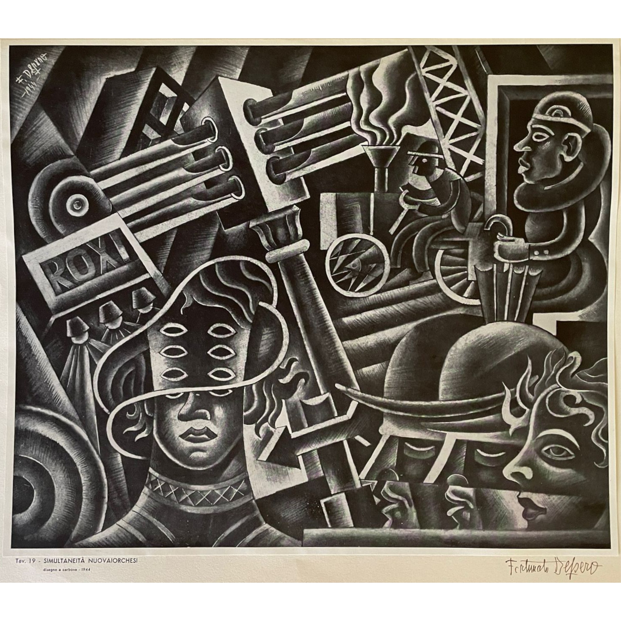 Fortunato Depero, Simultaneità nuovaiorchesi, (1944) stampa litografica con firma autografa su supporto, cm 39x52 L'opera è tratta dal fascicolo intitolato "Ventidue disegni del pittore poeta Depero", stampato dallo stesso nel 1944 con tiratura totale di 200 esemplari. La presente corrisponde alla tav. 19 ed è tratta dal portfolio nr. 107 / 200