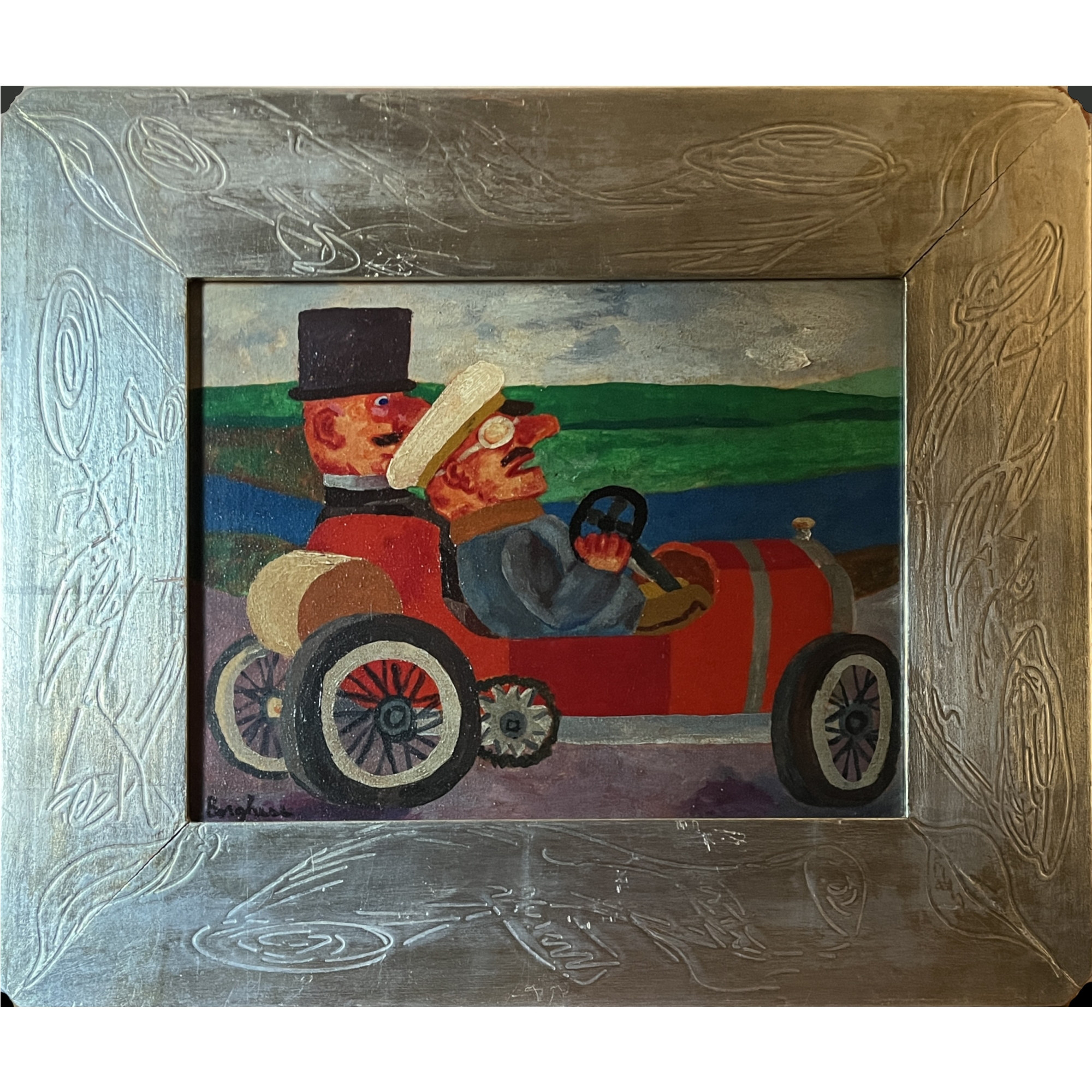 Franz Borghese , L’automobile (1970), olio su tela, cm 30x40. Opera con autentica su fotografia della Galleria d'Arte "La Firma" di Riva del Garda (TN). L'opera è stata inoltre archiviata personalmente dell'autore in data 07.05.1999 con il titolo “Il bolide rosso” e nr. archivio personale L7TM057756009. Si segnala inoltre che l'archiviazione personale effettuata a suo tempo dall'artista è possibile aggiornarla con apposita richiesta presso l' Archivio Ufficiale odierno (Artresanterasmo). LOTTO SOTTO RISERVA