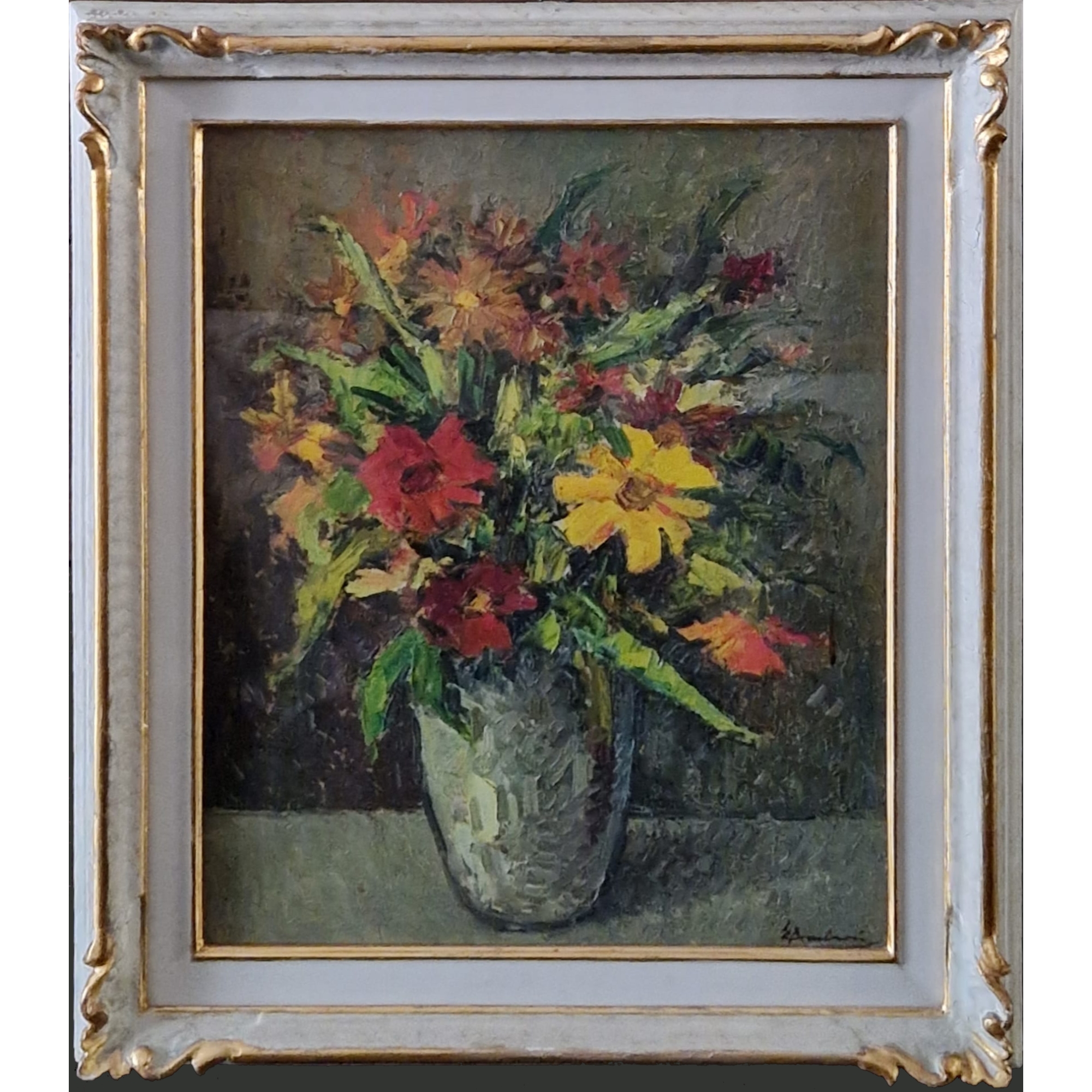 Elmo Ambrosi, Vaso con fiori gialli e rossi, olio su tavola, cm 50x40, cornice coeva