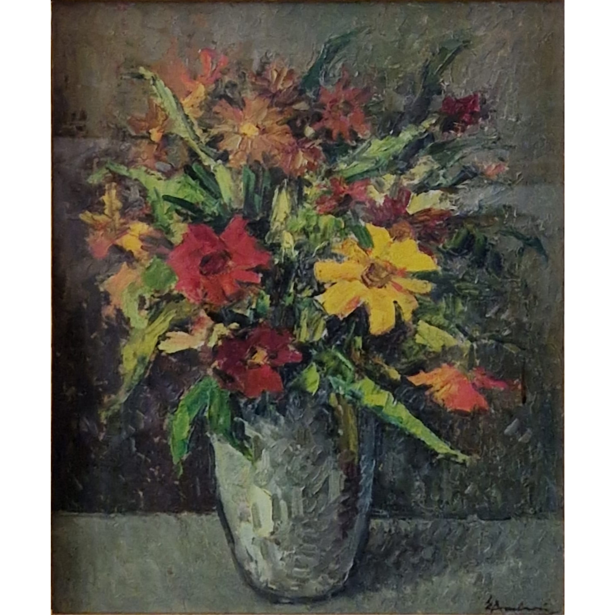 Elmo Ambrosi, Vaso con fiori gialli e rossi, olio su tavola, cm 50x40,...