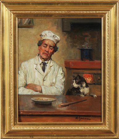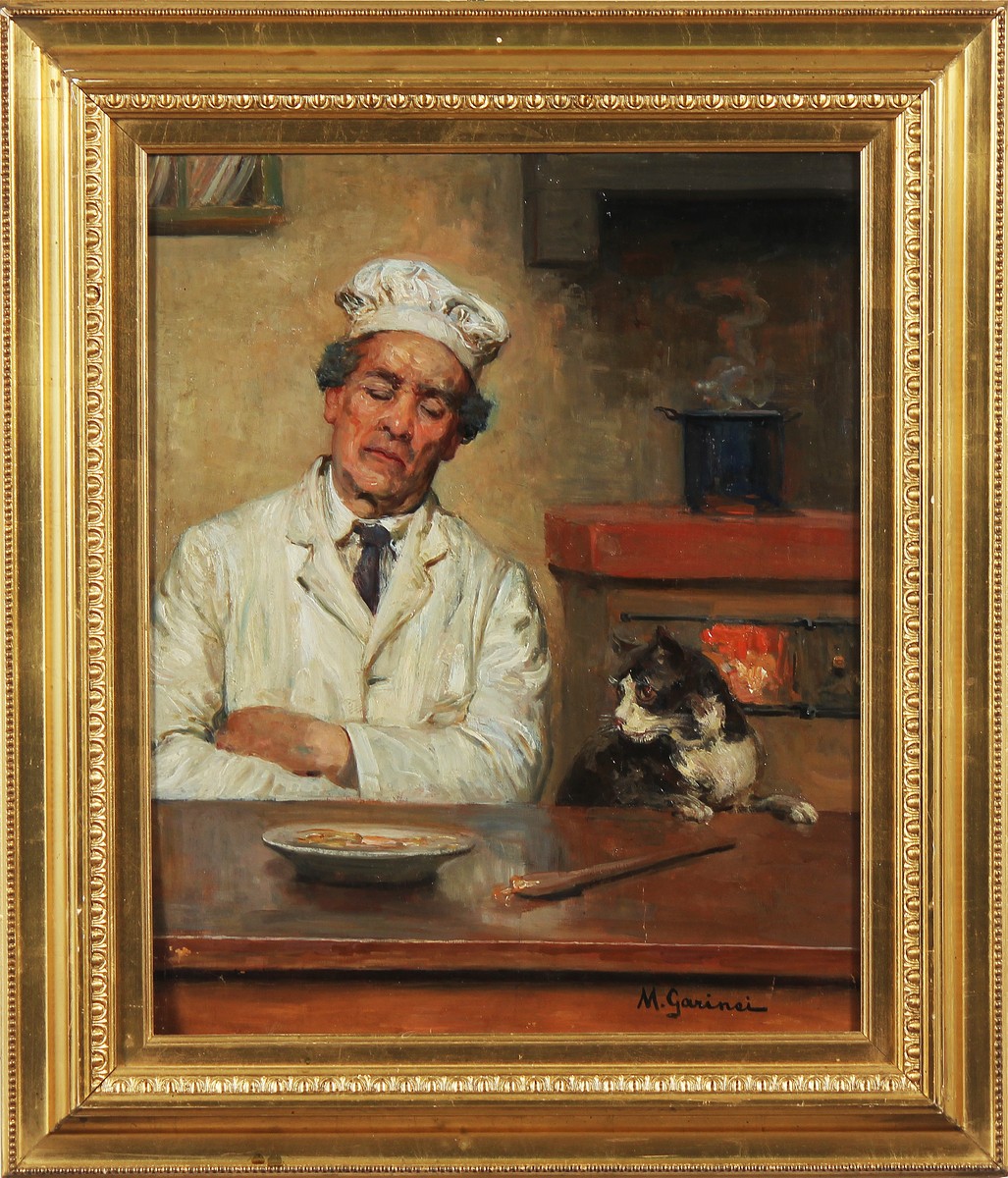 GARINEI MICHELE (1871 - 1960) Gatto furbo. Olio su tavola. Cm 39,00 x 46,50. Firma in basso a destra. Cornice presente