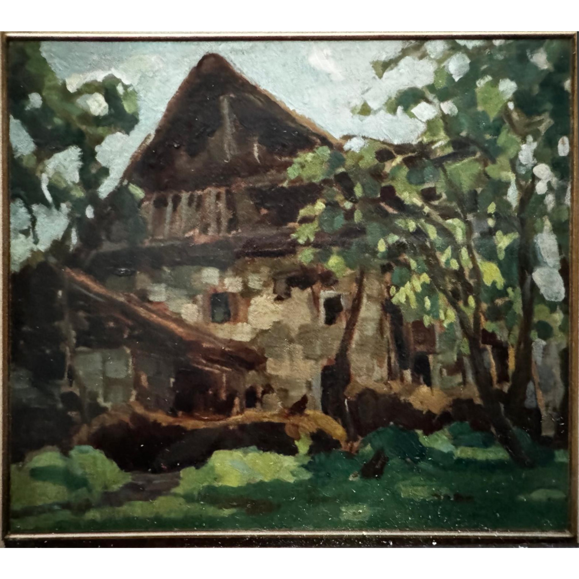 (prob.) Pizzini Carlo, Casa di montagna, olio su cartone, anni '20, cm 24x27. In cornice. Non firmato
