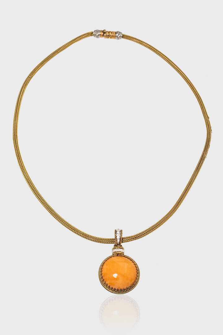 in oro giallo e bianco 8 Kt con ciondolo con semisfera di corallo mediterraneo color salmone. Diamanti taglio brillante per totali ct 0,20 ca. Firmato "Moonlight"