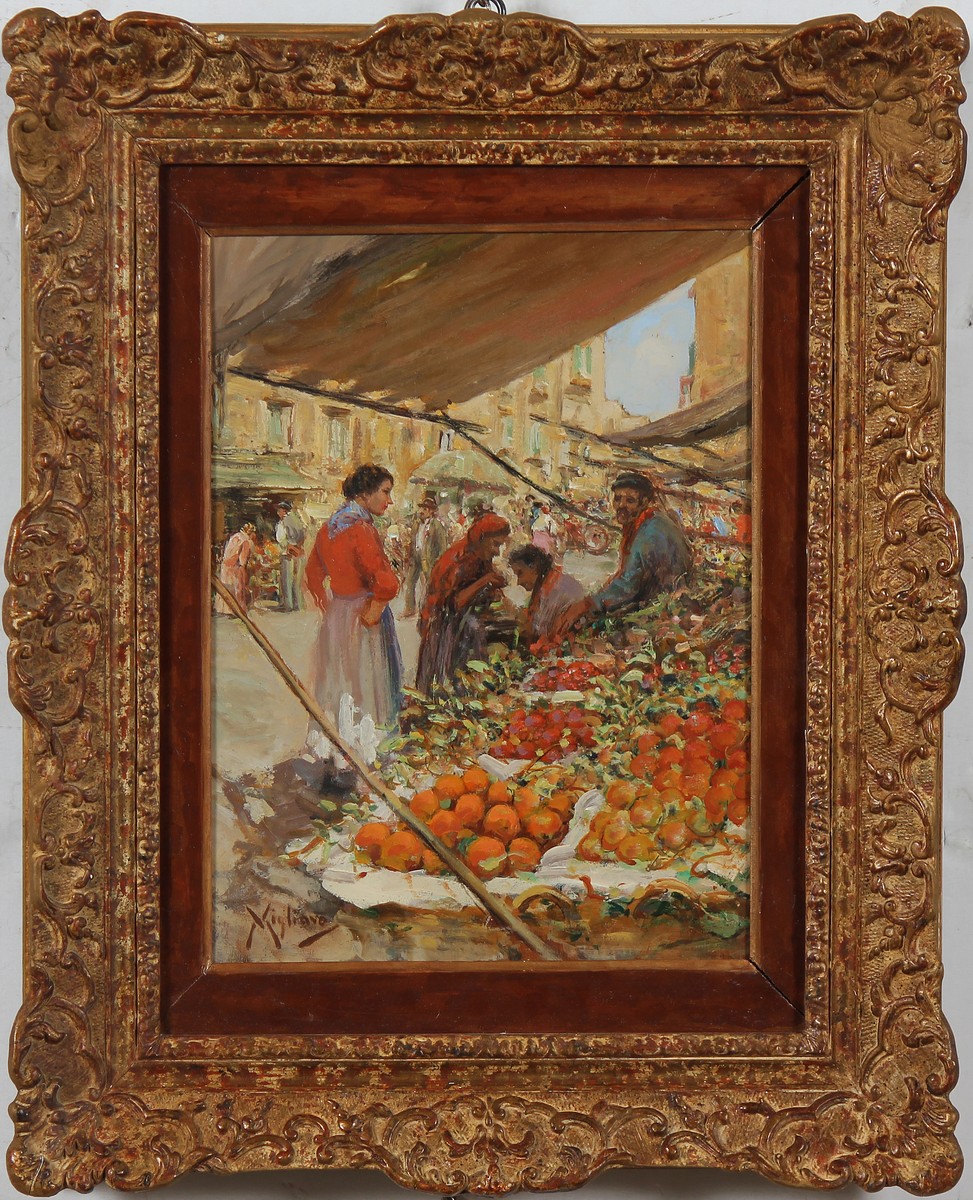 MIGLIARO VINCENZO (1858 - 1938) Personaggi al mercato. Olio su tavola. Cm 30,00 x 22,00. Firma in basso a destra. Cornice presente