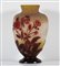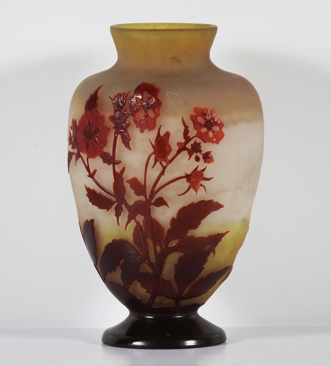 GALLE' EMILE (1846 - 1904) Rose selvatiche. Vetro. Cm 14,00 x 23,00 x 11,00. Vaso a balaustro in vetro doppio riposante su base circolare, decoro di rose selvatiche e foglie finemente inciso ad acido nei toni del rosso-arancio su fondo bianco e giallo. Firma in rilievo a cammeo Gallè, epoca 1900. Autentica di Franco Borga su fotografia.