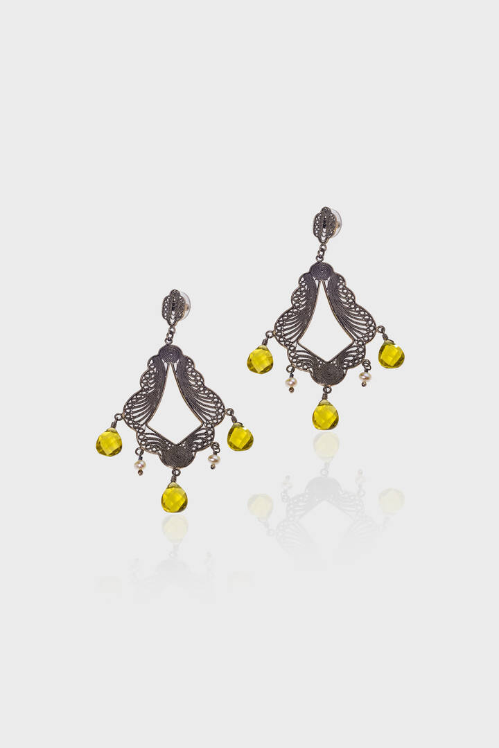 Coppia di orecchini in argento 925/1000 lavorati in filigrana con quarzi citrini sfaccettati a decoro. Firmati "Yvone Christa