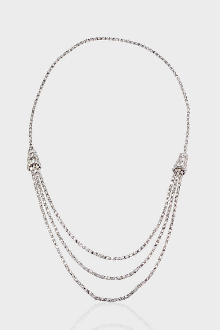 in oro bianco, al centro tre fili interamente in diamanti taglio 8/8 per totali ct 3,0 ca