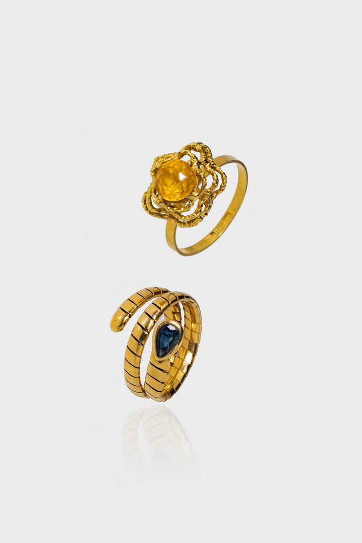 -a forma di serpente, con testa con zaffiro a goccia. Peso gr 3,9. Misura 10 (50)