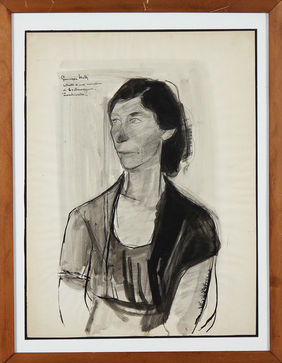 MOTTI GIUSEPPE (1908 - 1990) Ritratto di una mondina di Cortemaggiore. Tecnica mista su carta. Cm 46,00 x 61,00. Firma e titolo in alto a sinistra. Cornice presente