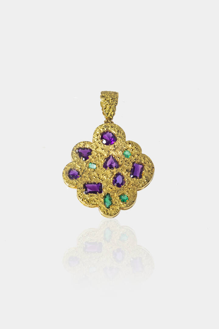 in oro giallo lavorato a corteccia, di forma polilobata, con ametiste e smeraldini per totali ct 0,80 ca taglio a goccia, triangolare, ovale e rettangolare.