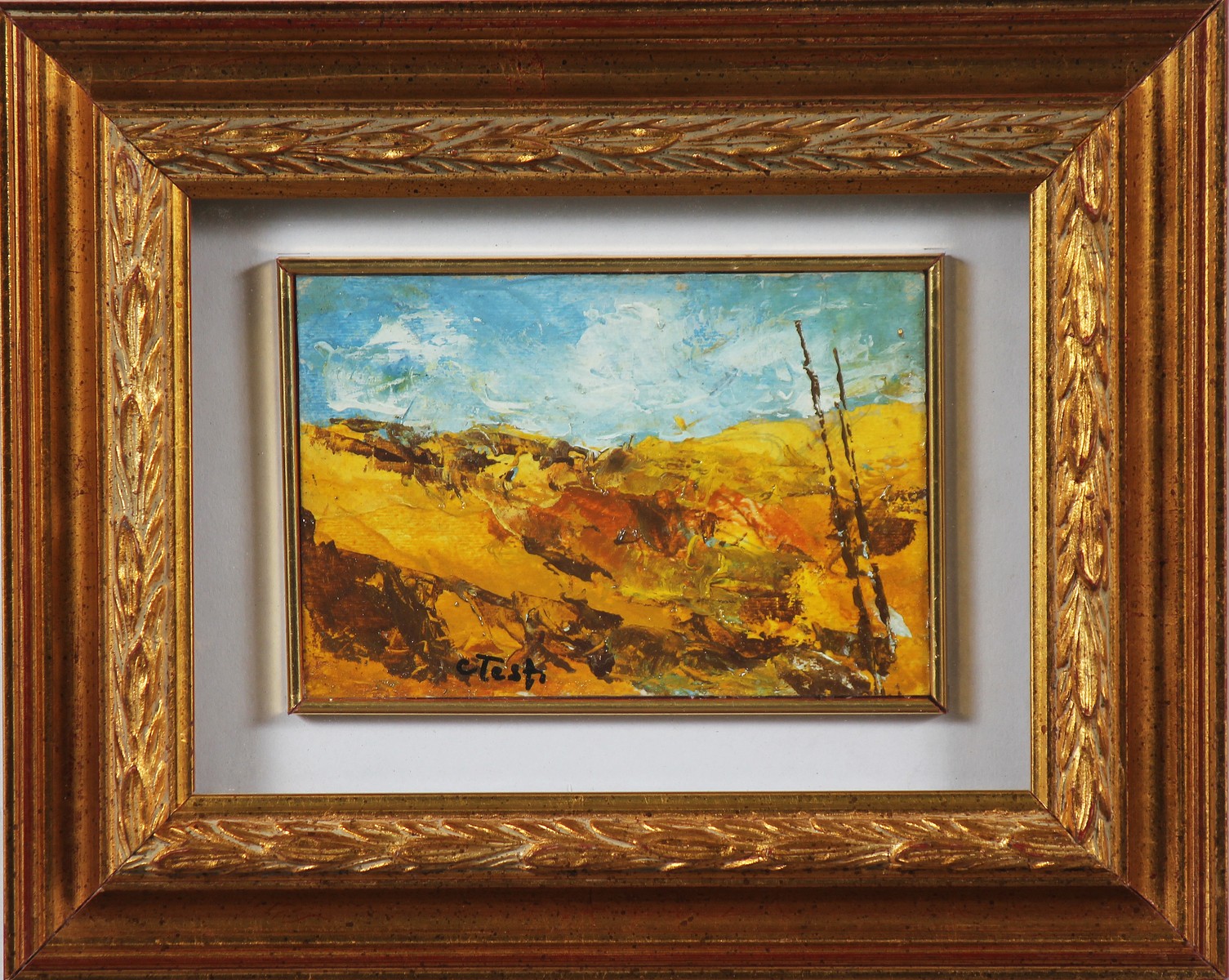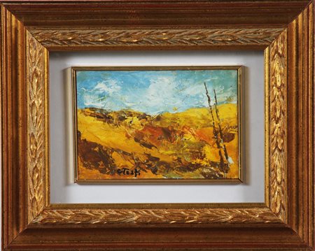 TESTI CARLO (n. 1918) Paesaggio montano d'estate. Olio su cartone pressato. Cm 15,00 x 10,00. Firmato in basso a sinistra. Al retro cartiglio della Galleria Palazieta di Busto Arsizio. Cornice presente