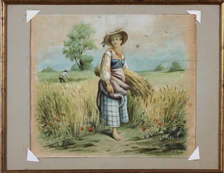 ANONIMO Contadina. Tecnica mista su carta. Cm 50,00 x 43,00. Firmato in basso a destra. Cornice presente