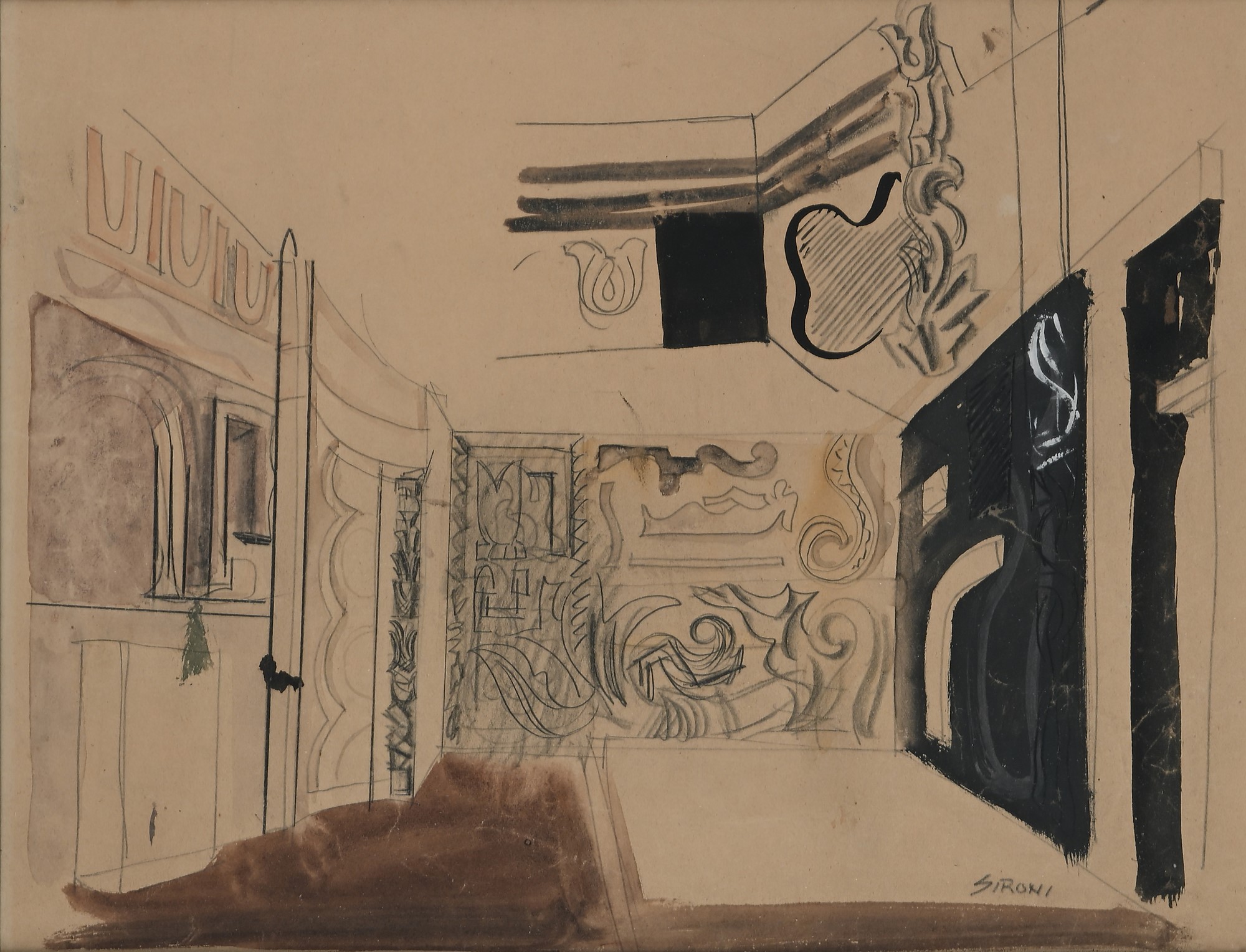 Interno con decorazioni 1936 circa Matita, matita grassa, tempera e tempera diluita su carta applicata su cartone cm 30x39,6 Firma apocrifa "Sironi" in basso a destra  Autentica rilasciata dall'Associazione per il Patrocinio e la Promozione della Figura e dell'Opera di Mario Sironi