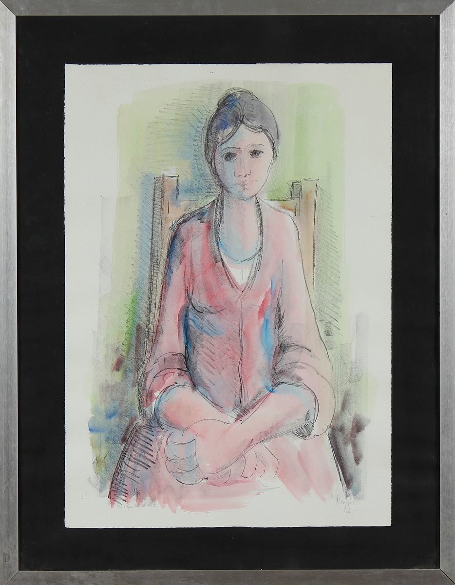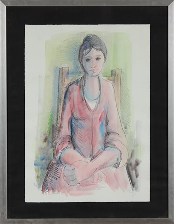 MAGGI GIAMPIETRO (n. 1934) Figura di donna. Acquerello su carta. Cm 50,00 x 70,00. Firma in basso a destra. Al retro articolo descrittivo del pittore. Cornice presente