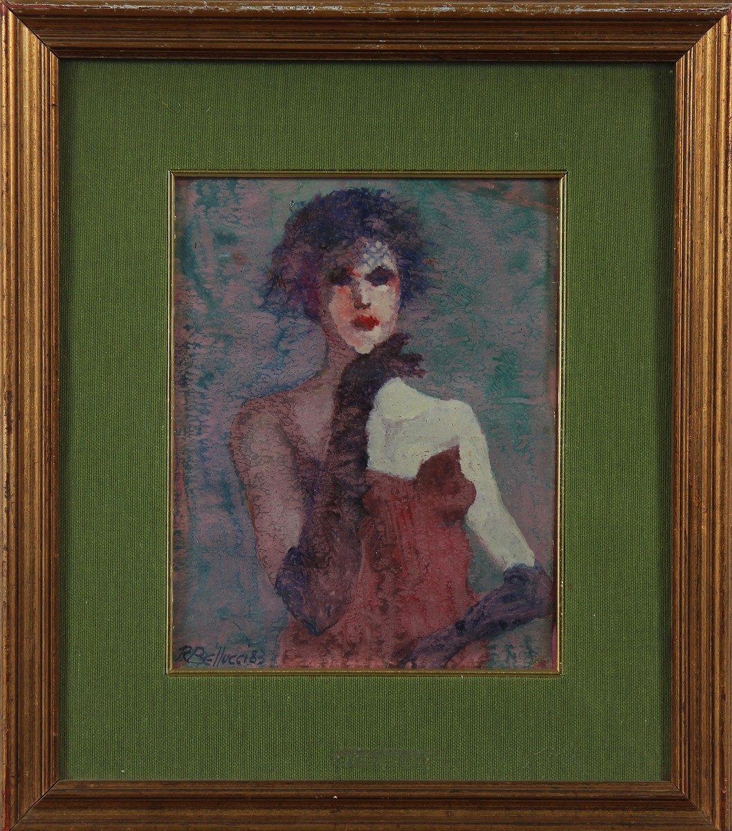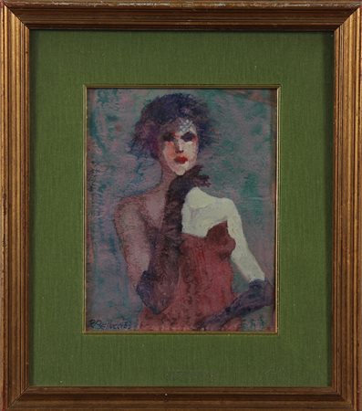 BELLUCCI ROMEO (n. 1923) Signora in veletta. 1983. Olio su carta. Cm 20,00 x 25,00. Firma in basso a destra. Al retro firma titolo e anno. Cornice presente